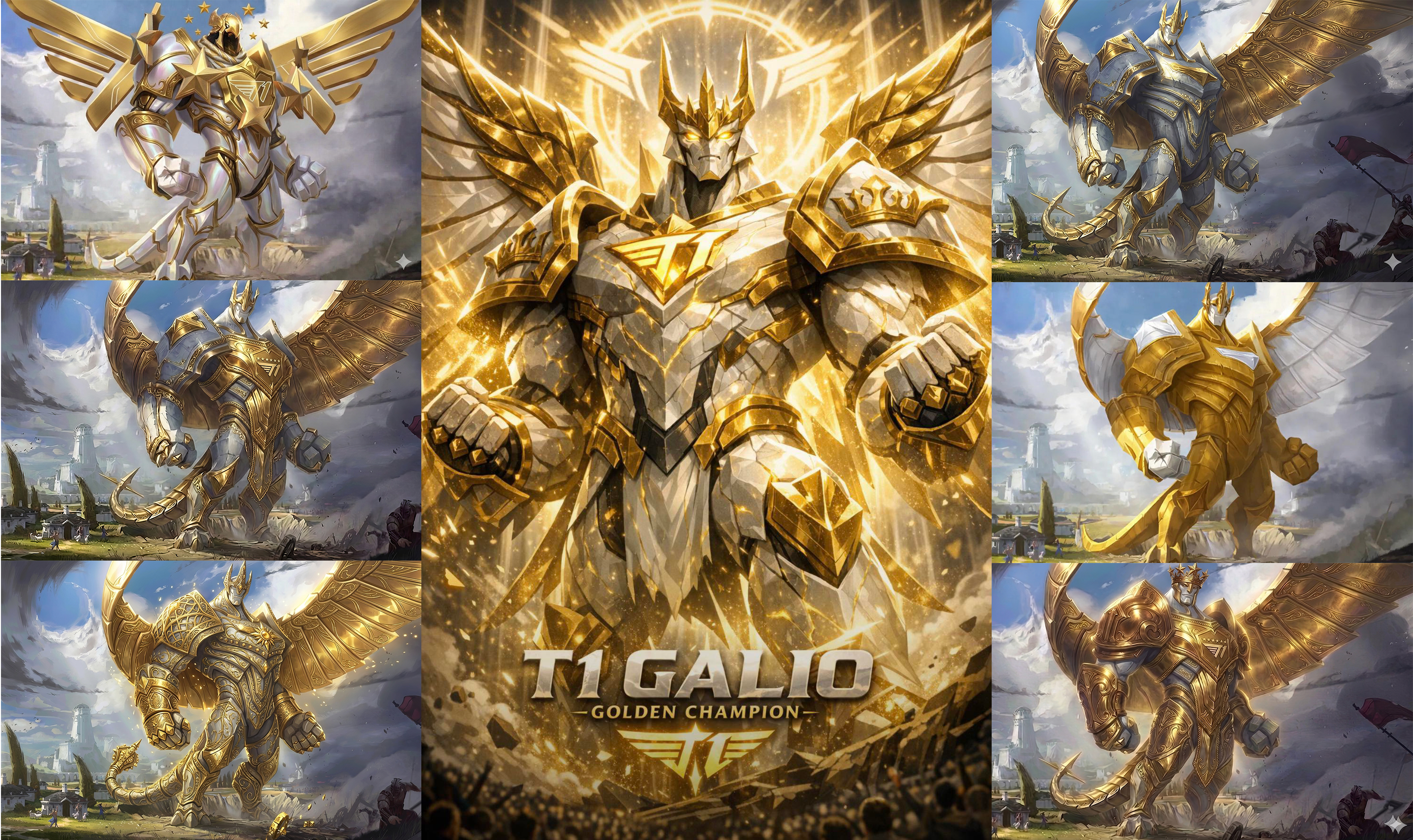 Galio được tái hiện với bộ giáp trắng chủ đạo, kết hợp cùng các chi tiết vàng kim, tạo cảm giác uy nghi và quyền năng. Phong cách này được đánh giá là phù hợp với vị thế biểu tượng của một vị tướng gắn liền với chiến thắng của T1.