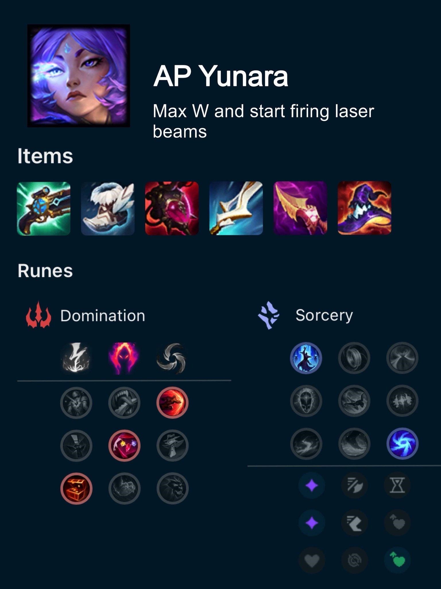 AP Yunara là một trong những lối build dị cực thú vị. Điểm mạnh của lối chơi này nằm ở việc tối đa hóa sức mạnh kỹ năng W – tạo vệt máu, bứt tốc để truy đuổi và áp sát kẻ địch. Thậm chí, bạn có thể bỏ qua chiêu Q, chỉ cần bật R và “chọt thẳng” là đủ tiễn đối phương lên bảng.