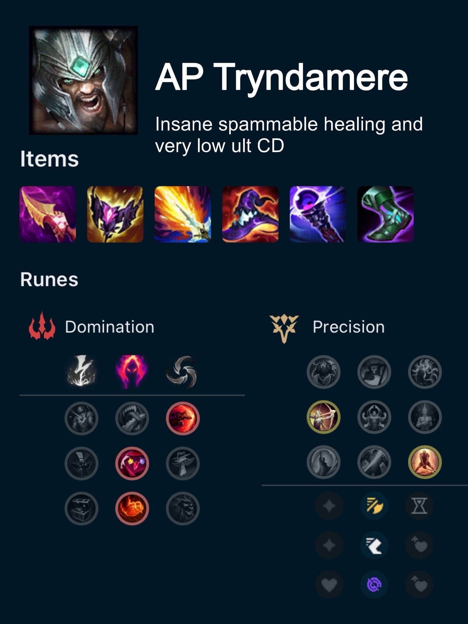 Tryndamere khi lên full AP và liên tục spam Q (Say Máu) sẽ hồi máu cực mạnh, giúp hắn sống sót lâu và liên tục lao vào tuyến sau kẻ địch. Lối chơi này không còn phụ thuộc vào chí mạng từ đòn đánh thường như truyền thống, mà tận dụng tối đa sát thương phép và khả năng hồi phục từ kỹ năng Q.