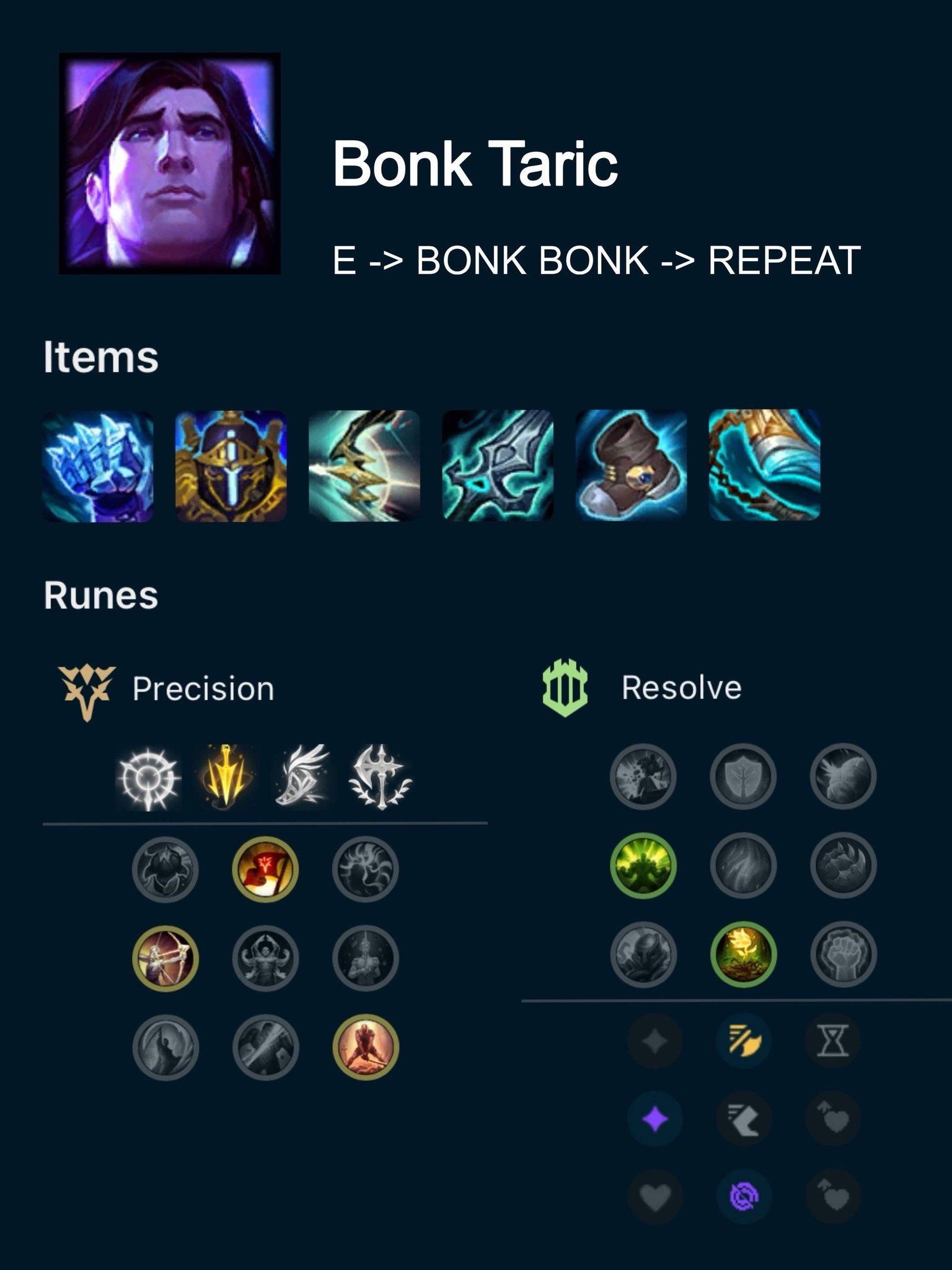 Taric trong ARURF sở hữu combo đơn giản nhưng “ức chế” bậc nhất: đánh thường → E (Starlight’s Touch) hồi máu và tăng sát thương → đánh thường → E → lặp lại. Nhờ tốc độ đánh cao, E trúng liên tục khiến đối thủ không kịp phản ứng, chỉ còn nước “cầu cứu” hoặc chạy thẳng về nhà chính.