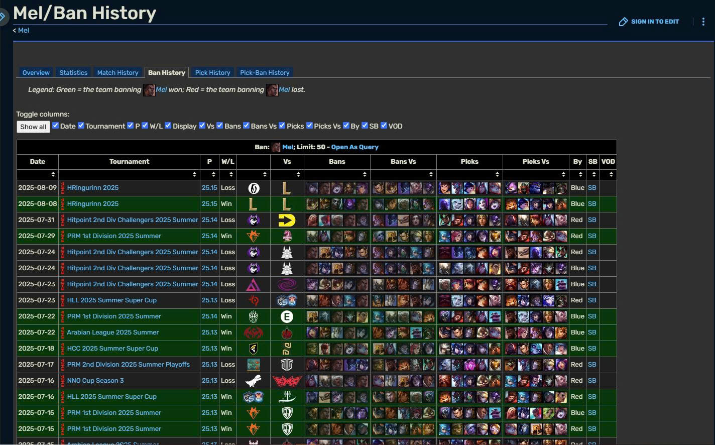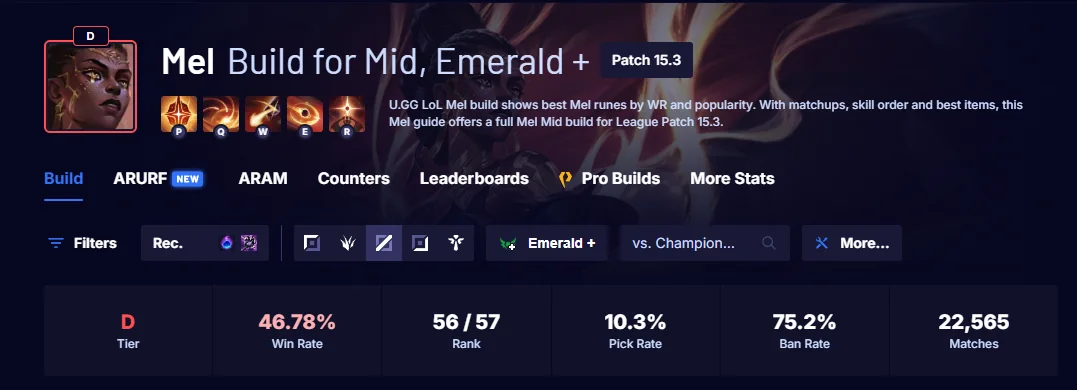 Ngay từ khi ra mắt, Mel đã nhanh chóng trở thành vị tướng bị cấm nhiều nhất ở cả solo queue lẫn các giải đấu chuyên nghiệp, với tỉ lệ cấm có thời điểm vượt 70%. Dù đã trải qua nhiều đợt giảm sức mạnh như hạ sát thương kỹ năng hay giảm tỉ lệ cộng AP, trải nghiệm đối đầu với Mel vẫn cực kỳ khó chịu và áp đảo. Nhiều người chơi phản ánh rằng Mel “quá khó chịu để đối đầu” và “mất vui khi gặp” trên khắp các diễn đàn, Reddit và các kênh truyền thông.