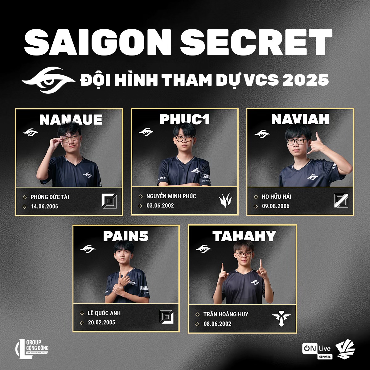 - Saigon Secret (SS): Bí ẩn chờ được khai phá: Cái tên Saigon Secret đã gợi lên sự tò mò cho giới chuyên môn và người hâm mộ. Được xây dựng trên nền tảng những tài năng trẻ đầy triển vọng, SS hứa hẹn sẽ mang đến những chiến thuật độc đáo và lối chơi sáng tạo. Liệu những "bí mật" của SS có thể giúp họ vượt qua những thử thách khắc nghiệt của VCS?