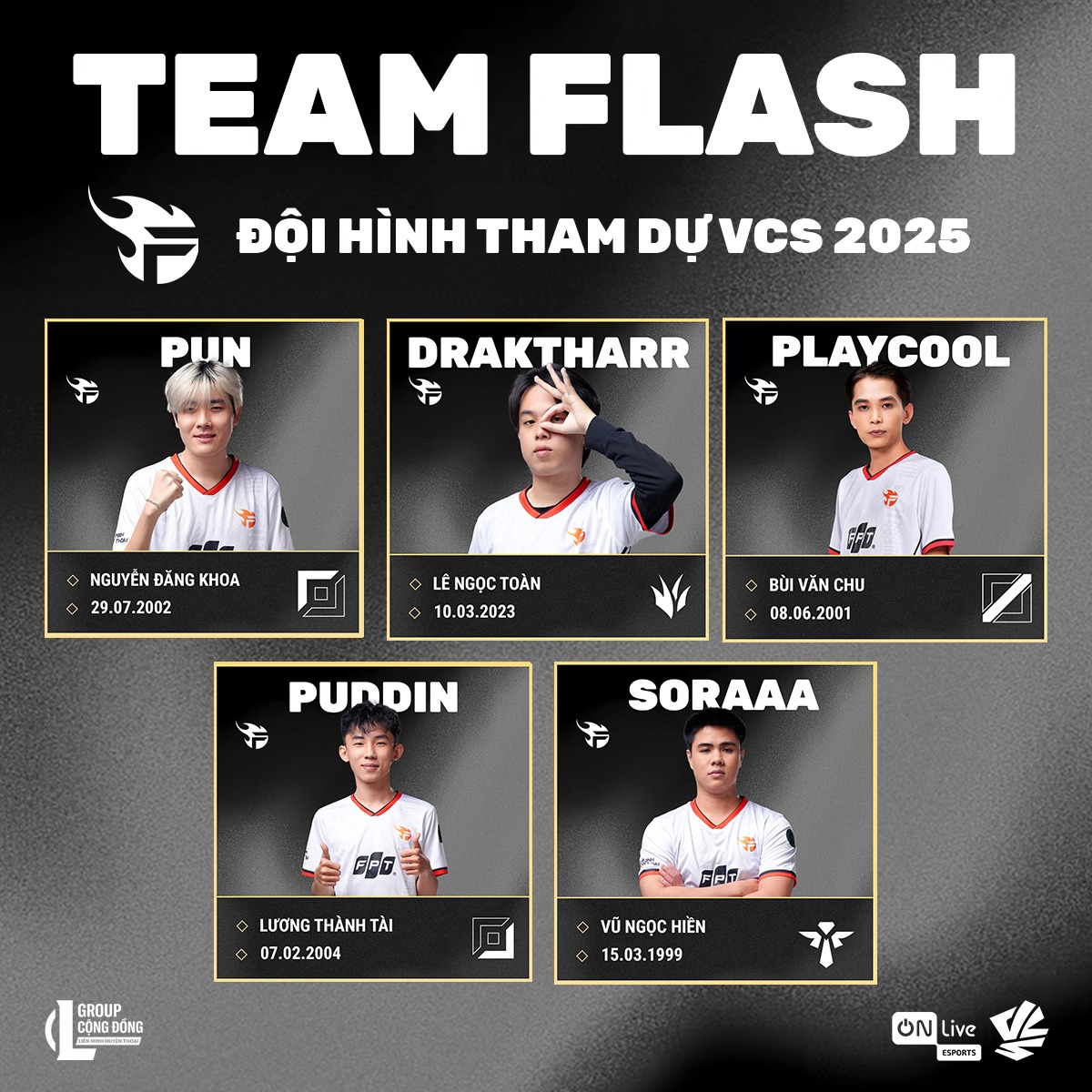 - Team Flash (TF): Huyền thoại tái xuất: Sau một thời gian vắng bóng, Team Flash đã chính thức trở lại đấu trường VCS! Sự trở lại của một tượng đài trong làng Liên Minh Huyền Thoại Việt Nam đã làm nức lòng người hâm mộ. Với kinh nghiệm dày dặn và bản lĩnh đã được chứng minh, TF hứa hẹn sẽ mang đến những trận đấu mãn nhãn và những màn trình diễn đỉnh cao. Liệu "huyền thoại" Team Flash có thể tái hiện lại những vinh quang trong quá khứ?