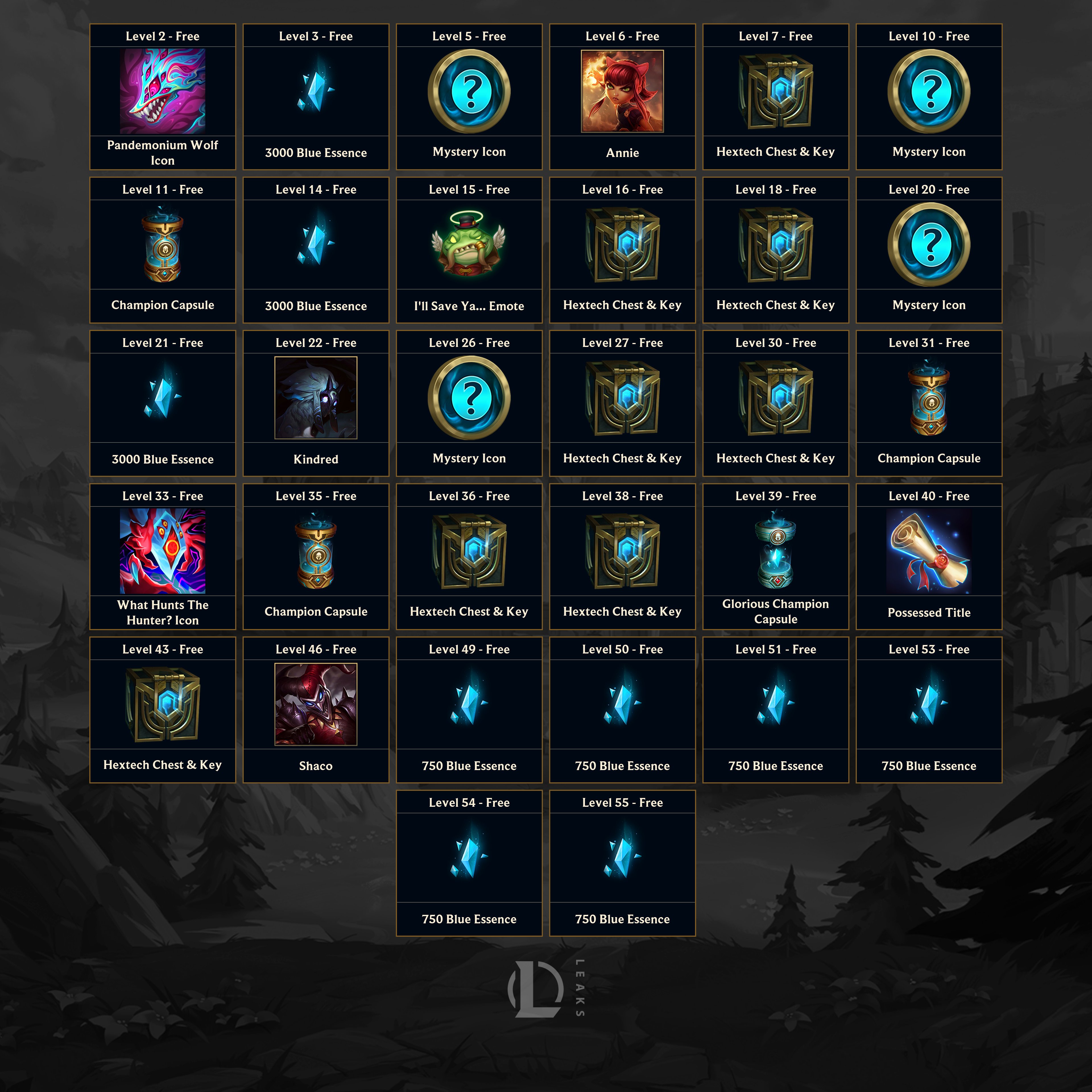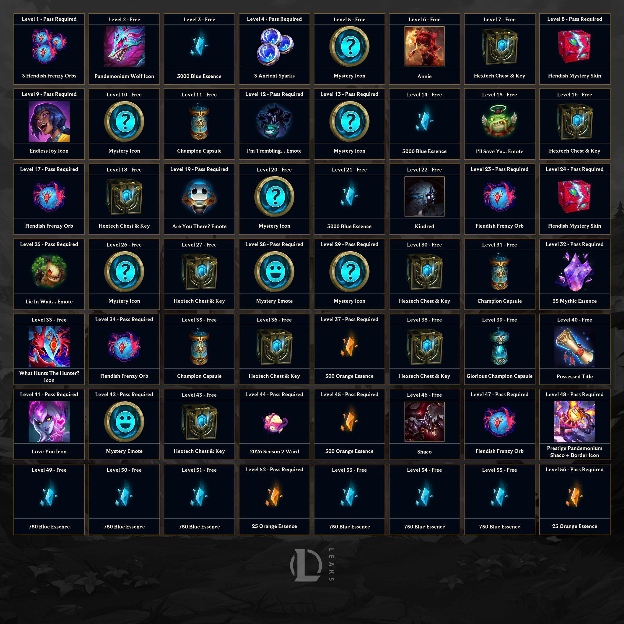 - Vật phẩm giá trị: 25 Tinh Hoa Thần Thoại (mốc 32), các viên sự kiện (Fiendish Frenzy Orbs) và Rương Hextech.