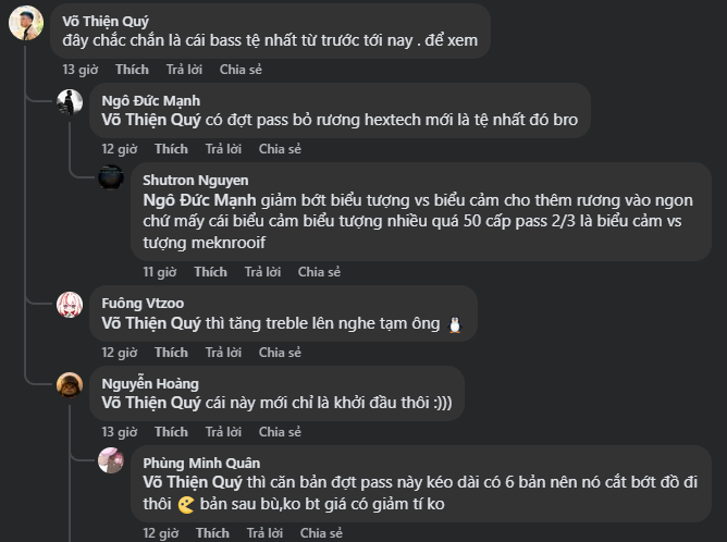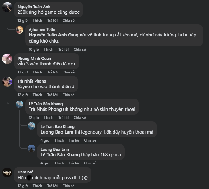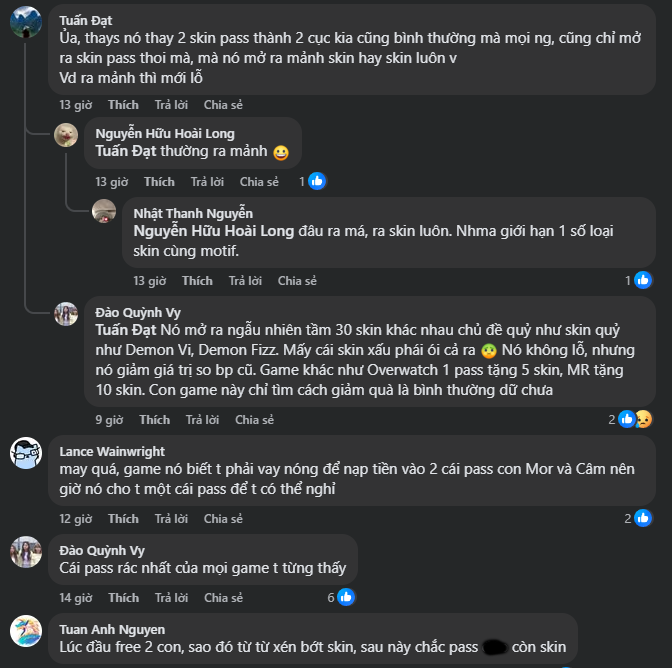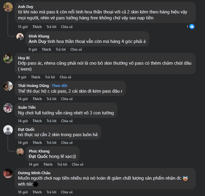 - "Từ khi nào mà pass không còn nổi tinh hoa thần thoại với cả 2 skin kèm theo vậy mọi người? Nhìn vé pass tưởng hàng free không chứ vậy sao nạp tiền?"