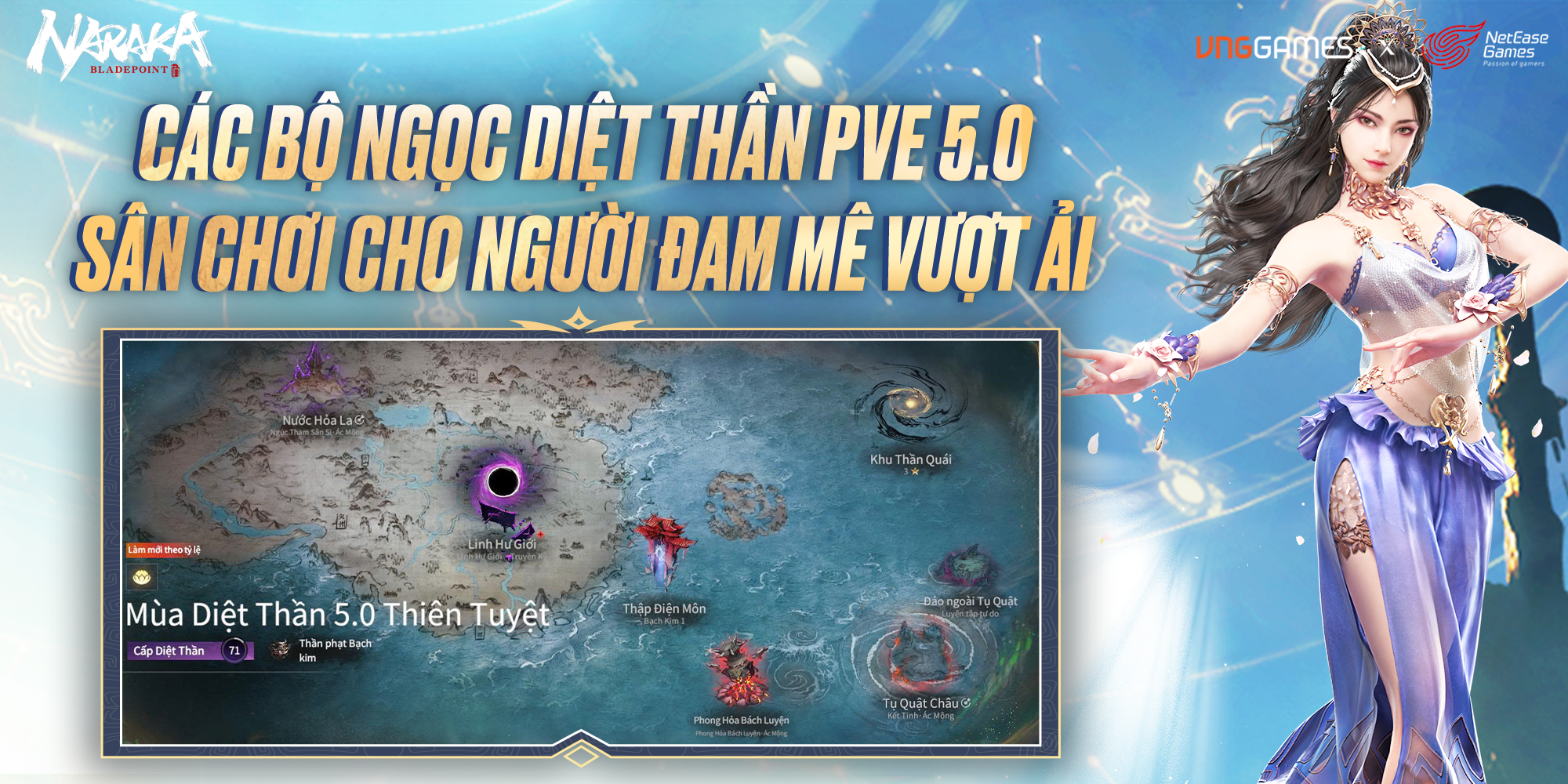 Diệt Thần là chế độ PvE tổ đội 3 người, nơi người chơi cùng đồng đội vượt qua chuỗi màn quái, mini-boss và boss để thu thập ngọc, trang bị cùng các tài nguyên nâng cấp trong NARAKA: Bladepoint. Lối chơi tập trung vào khả năng phối hợp, né - phản đòn chính xác và xây dựng bảng ngọc theo vai trò, nhằm tối ưu cả sát thương lẫn khả năng sinh tồn.