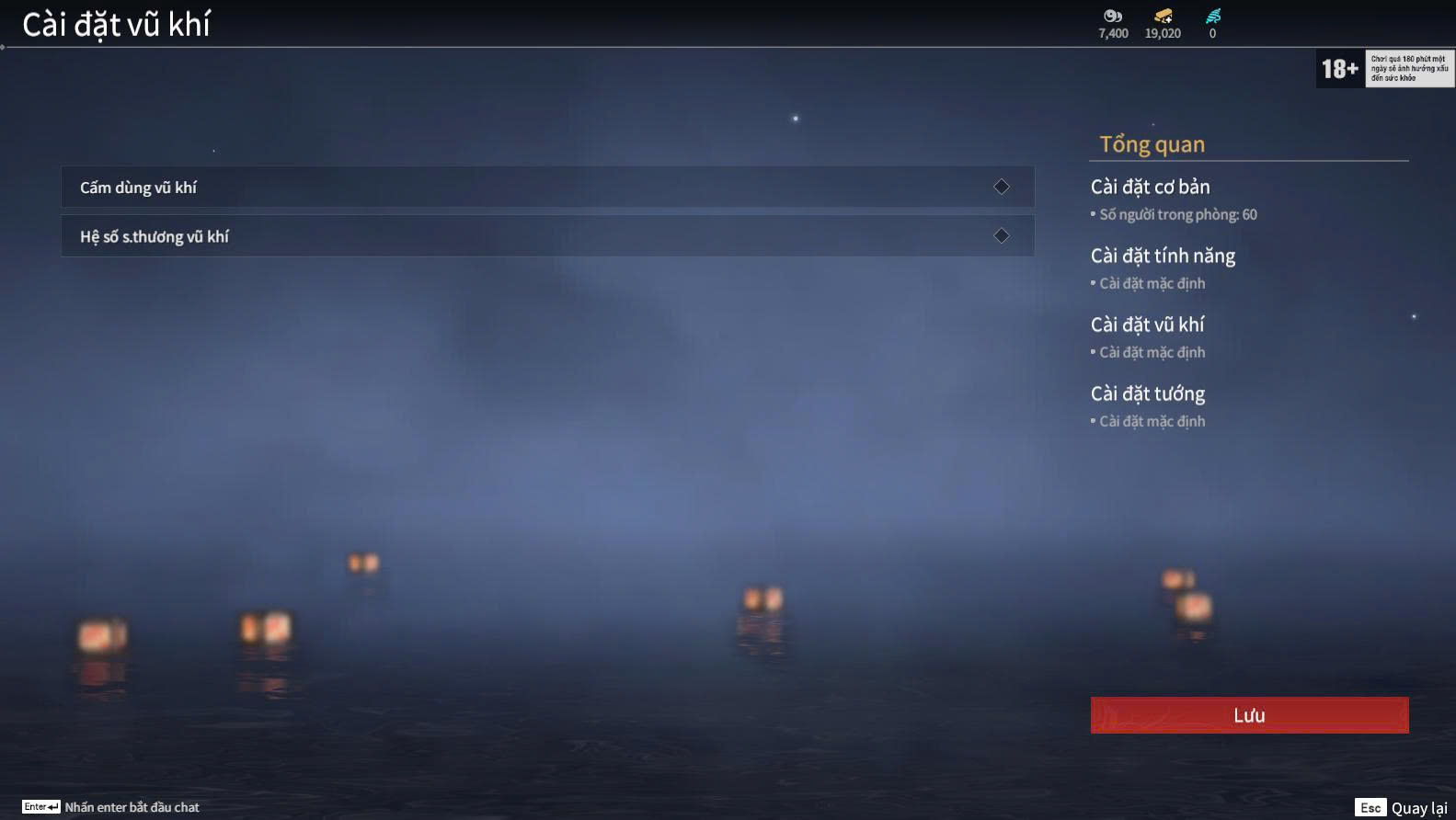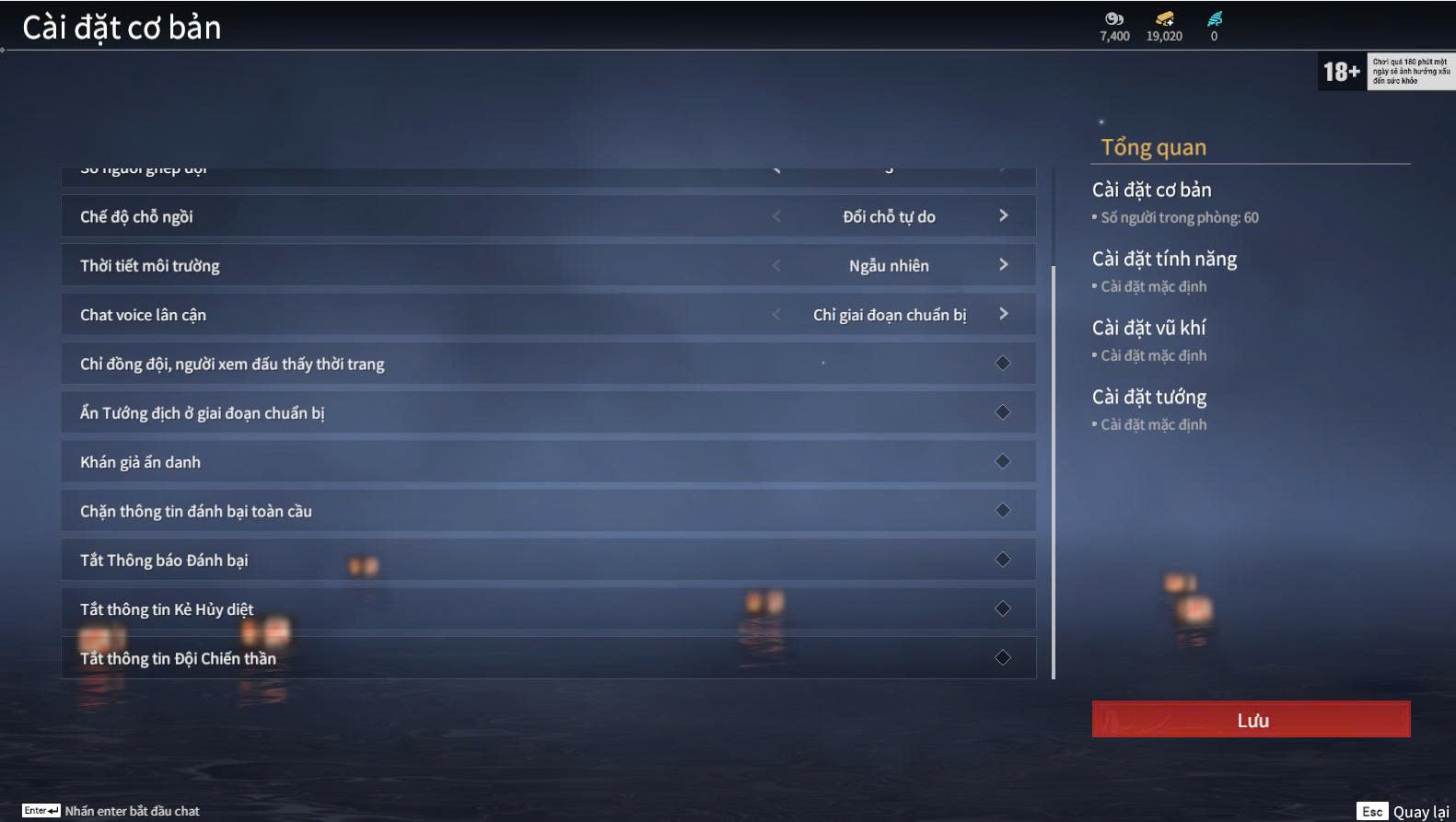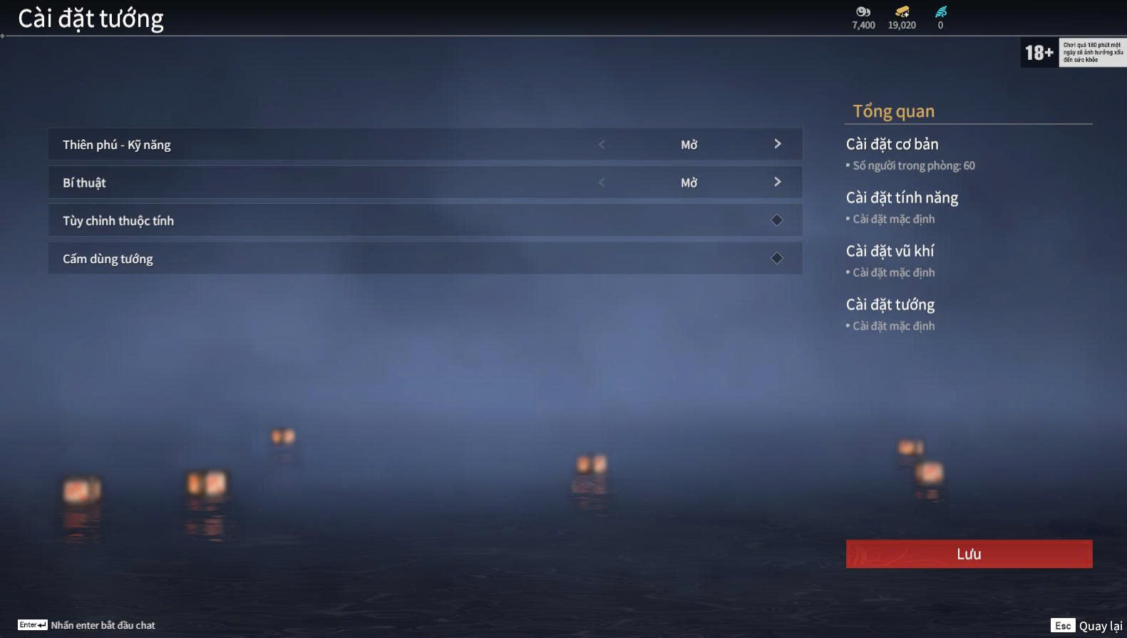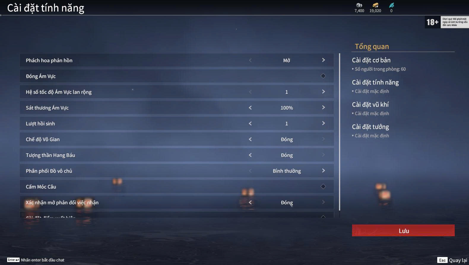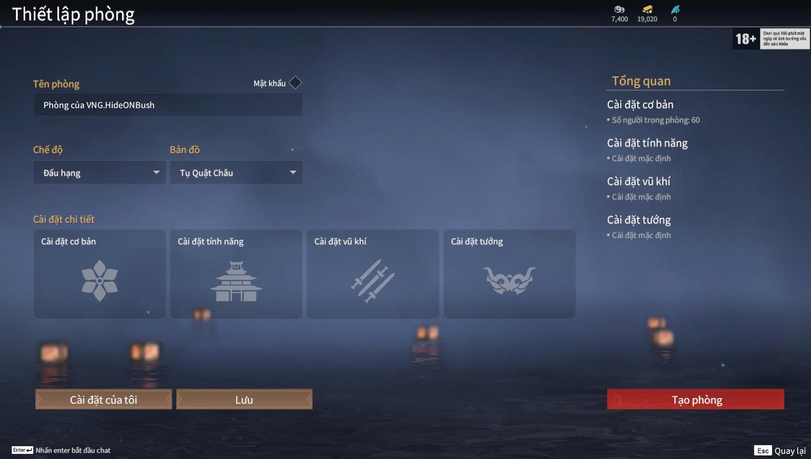 Trong phần cài đặt phòng, người chơi có thể tùy chỉnh: