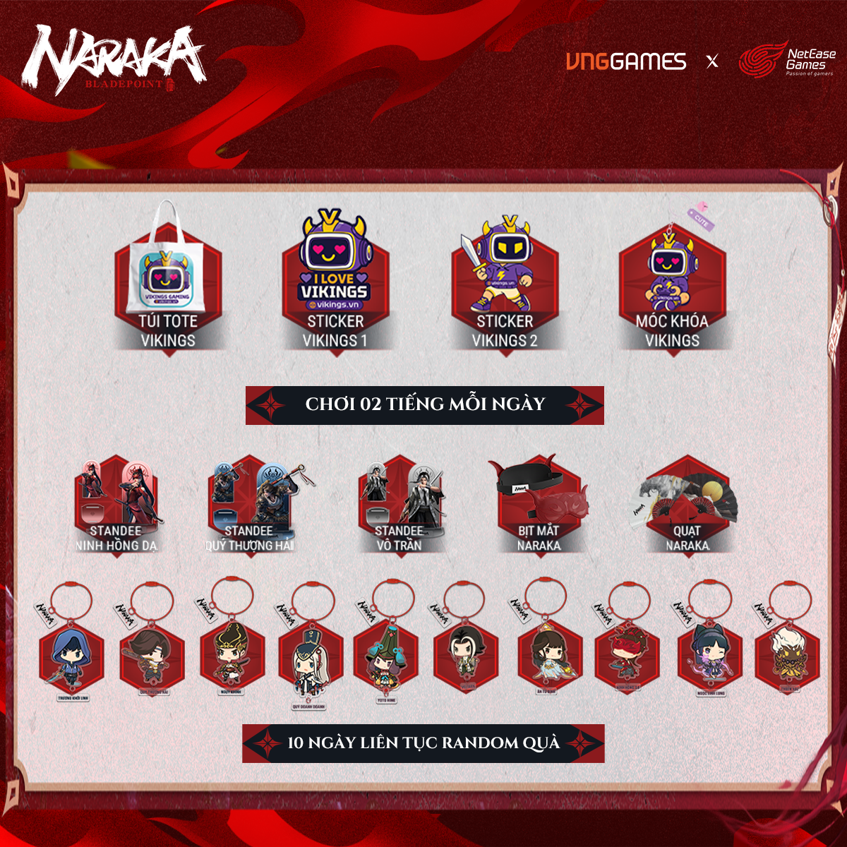 - Hoàn thành 02 giờ chơi mỗi ngày: nhận 01 code in-game NARAKA và 01 phần quà ngẫu nhiên từ Vikings.