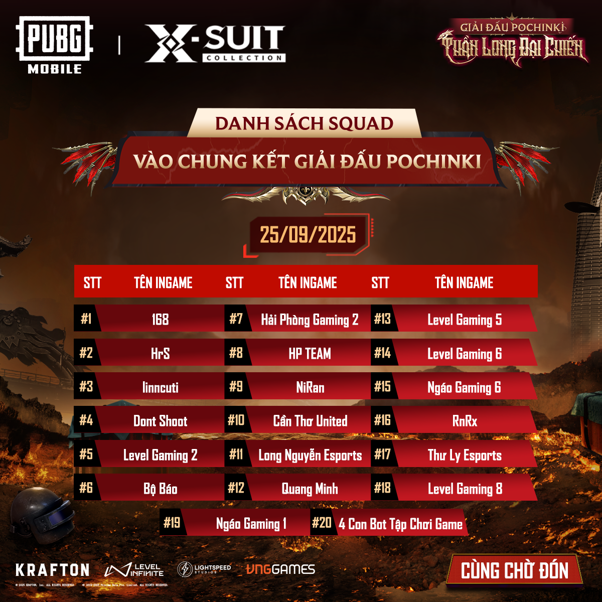 Bùng nổ đam mê, hội tụ bản lĩnh. Ai sẽ xưng vương tại Pochinki 2025? Hãy sẵn sàng – chiến trường đã điểm tên những đội tuyển xuất sắc nhất, và trận đấu thực sự sẽ chỉ bắt đầu tại Chung Kết này!