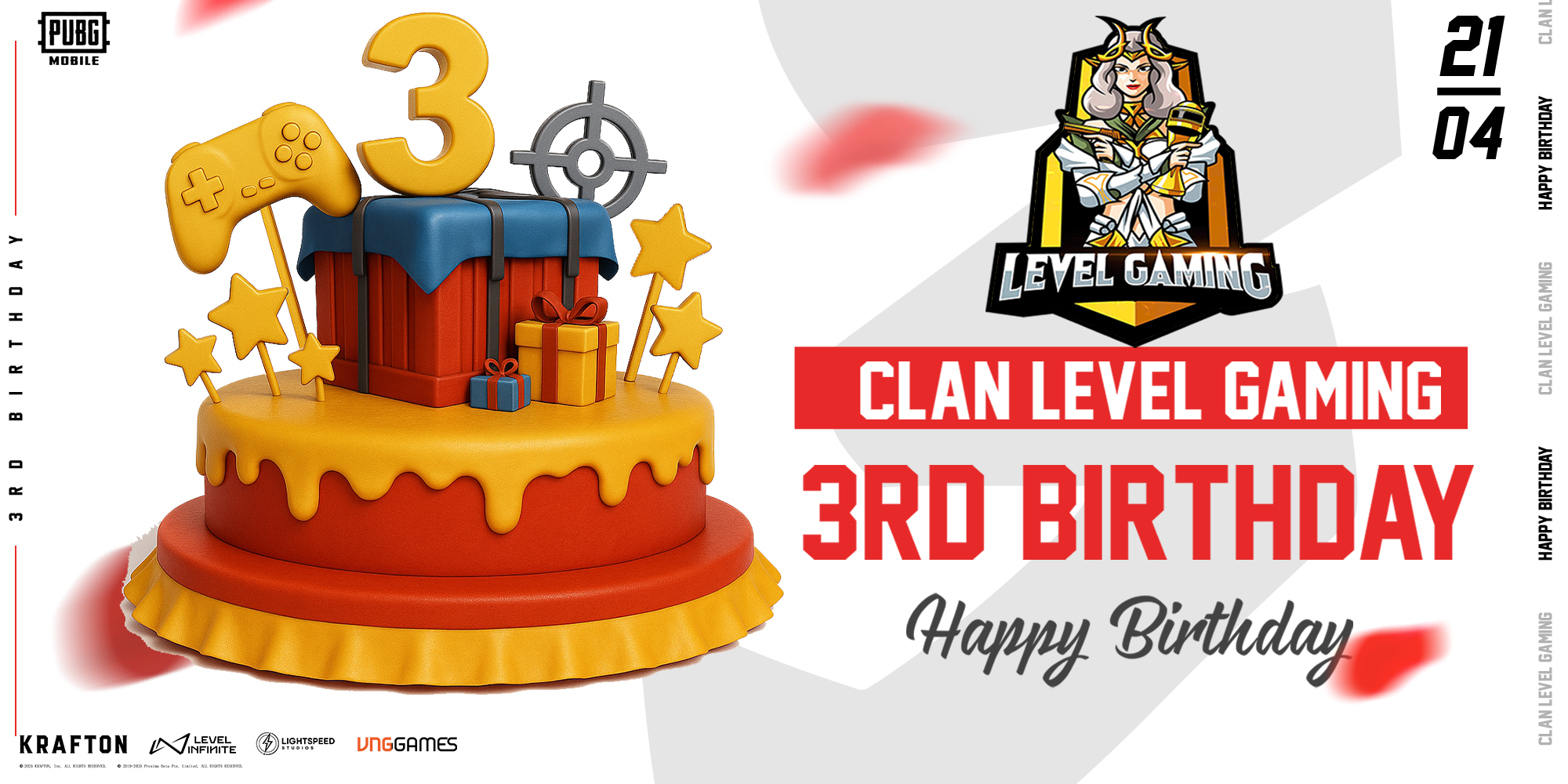 Hôm nay, Ban Điều Hành & cộng đồng PUBG MOBILE VN cùng chung vui và gửi lời chúc mừng nồng nhiệt nhất đến Clan Level Gaming nhân dịp kỷ niệm sinh nhật lần thứ 3 đầy ý nghĩa! Ba năm không ngừng nỗ lực, phát triển và xây dựng đã giúp Clan Level Gaming trở thành một trong những clan lớn mạnh và uy tín hàng đầu trong PUBG MOBILE.