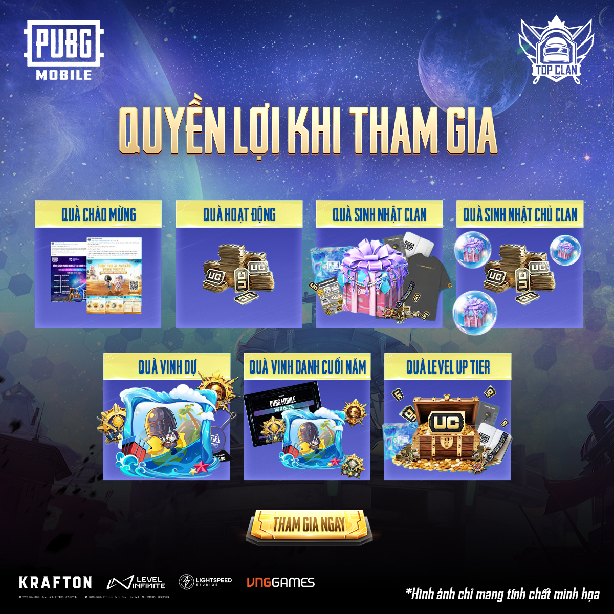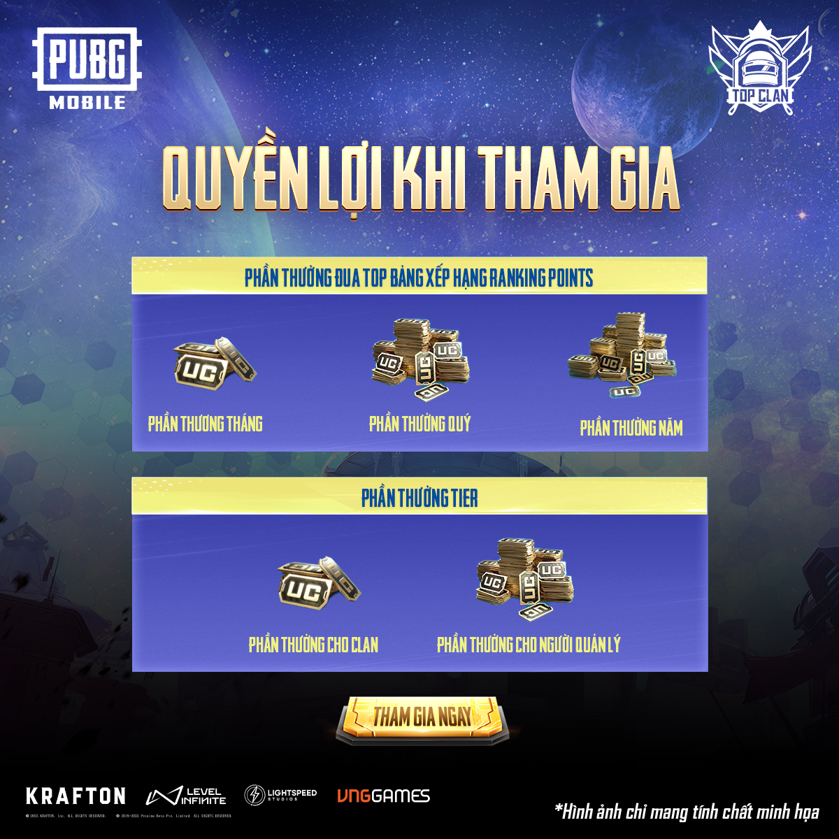 Khi tham gia hệ thống Top Clan 2025, các Clan sẽ được xếp hạng theo các tiêu chí nhất định. Clan đạt Tier càng cao sẽ nhận được nhiều quyền lợi và đãi ngộ hấp dẫn hơn, bao gồm hỗ trợ hoạt động, phần thưởng giá trị, vinh danh đặc biệt và nhiều đặc quyền truyền thông nổi bật.