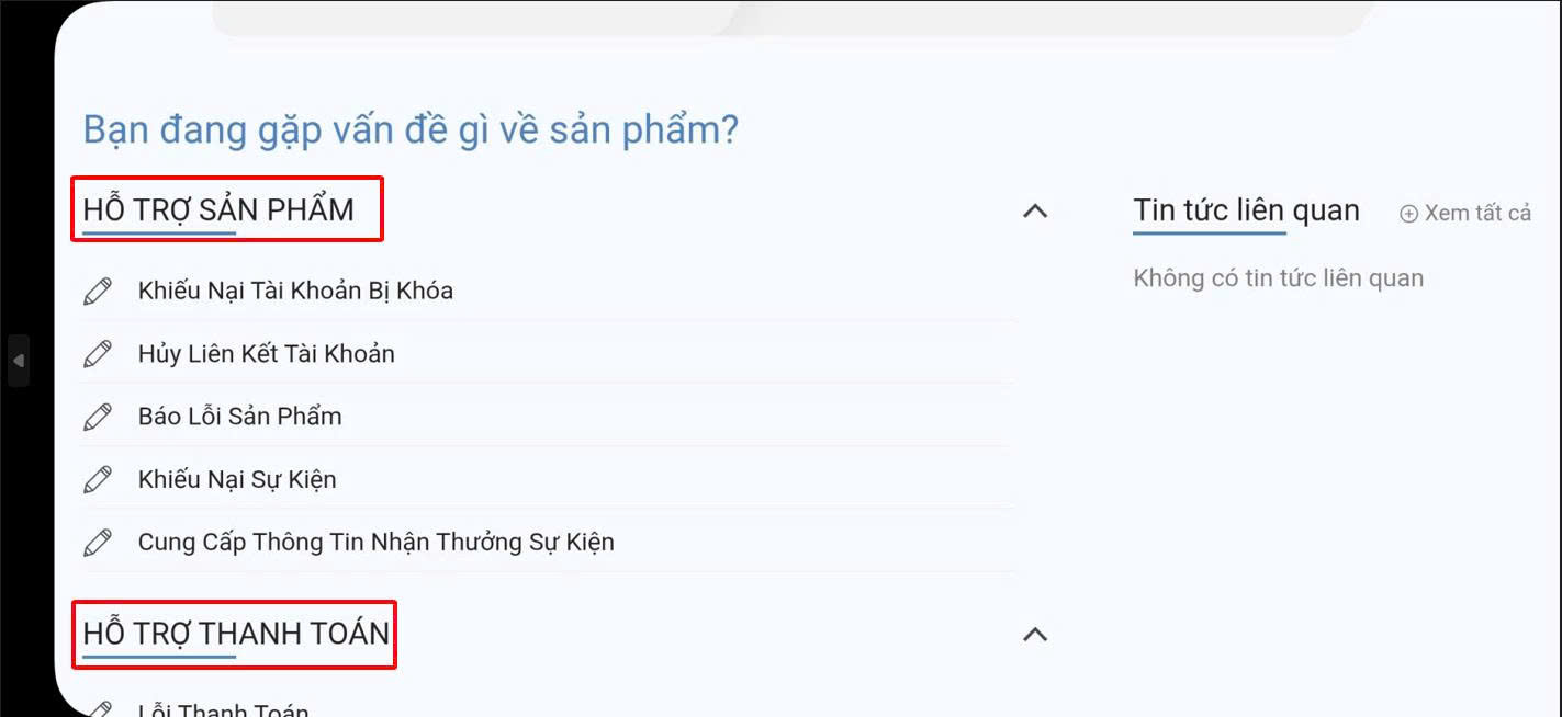 - Chọn phạm vi vấn đề bạn gặp phải: Tài khoản, nạp UC, lỗi kỹ thuật, báo cáo gian lận, v.v.