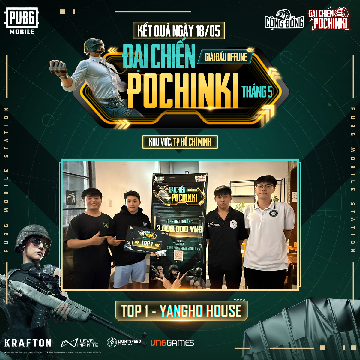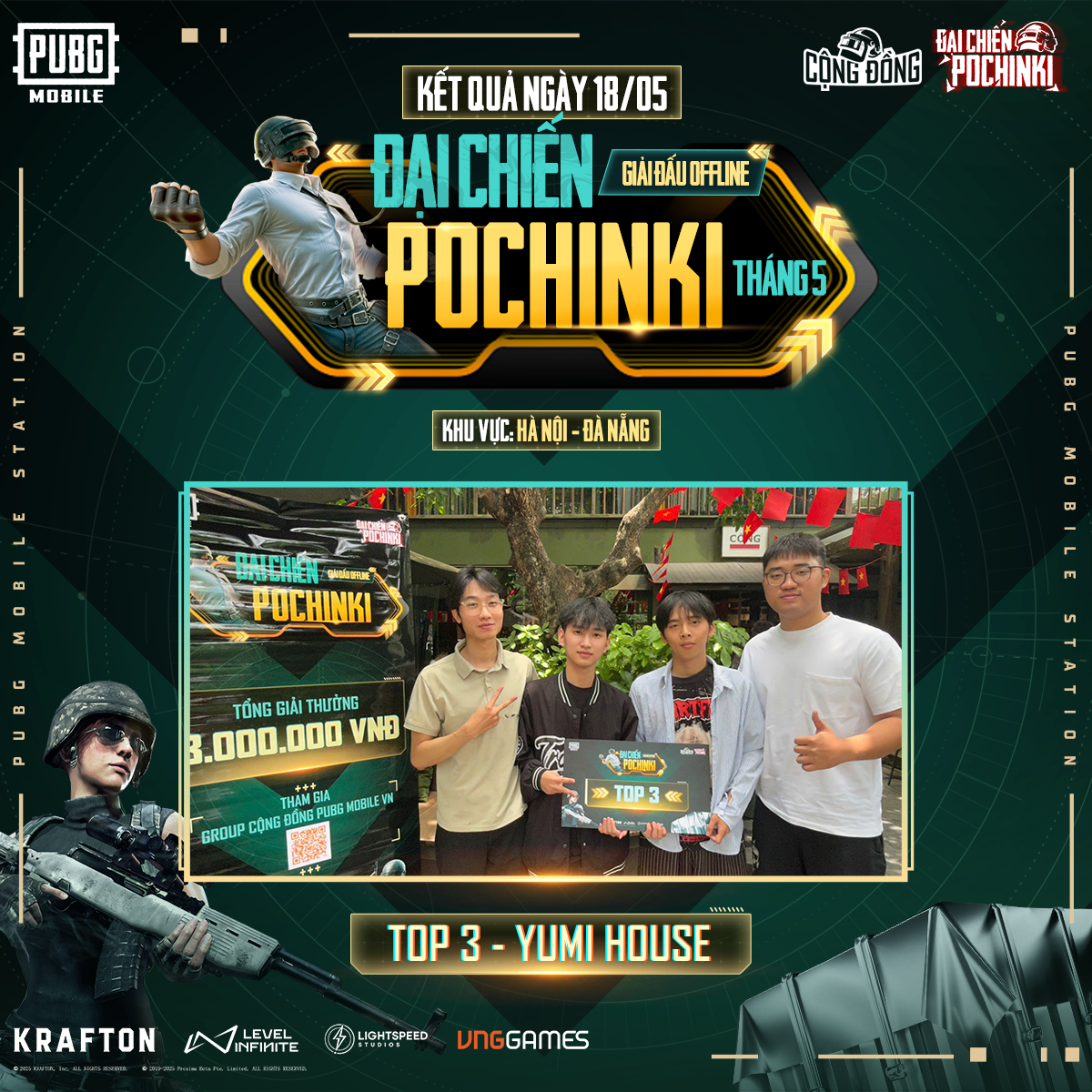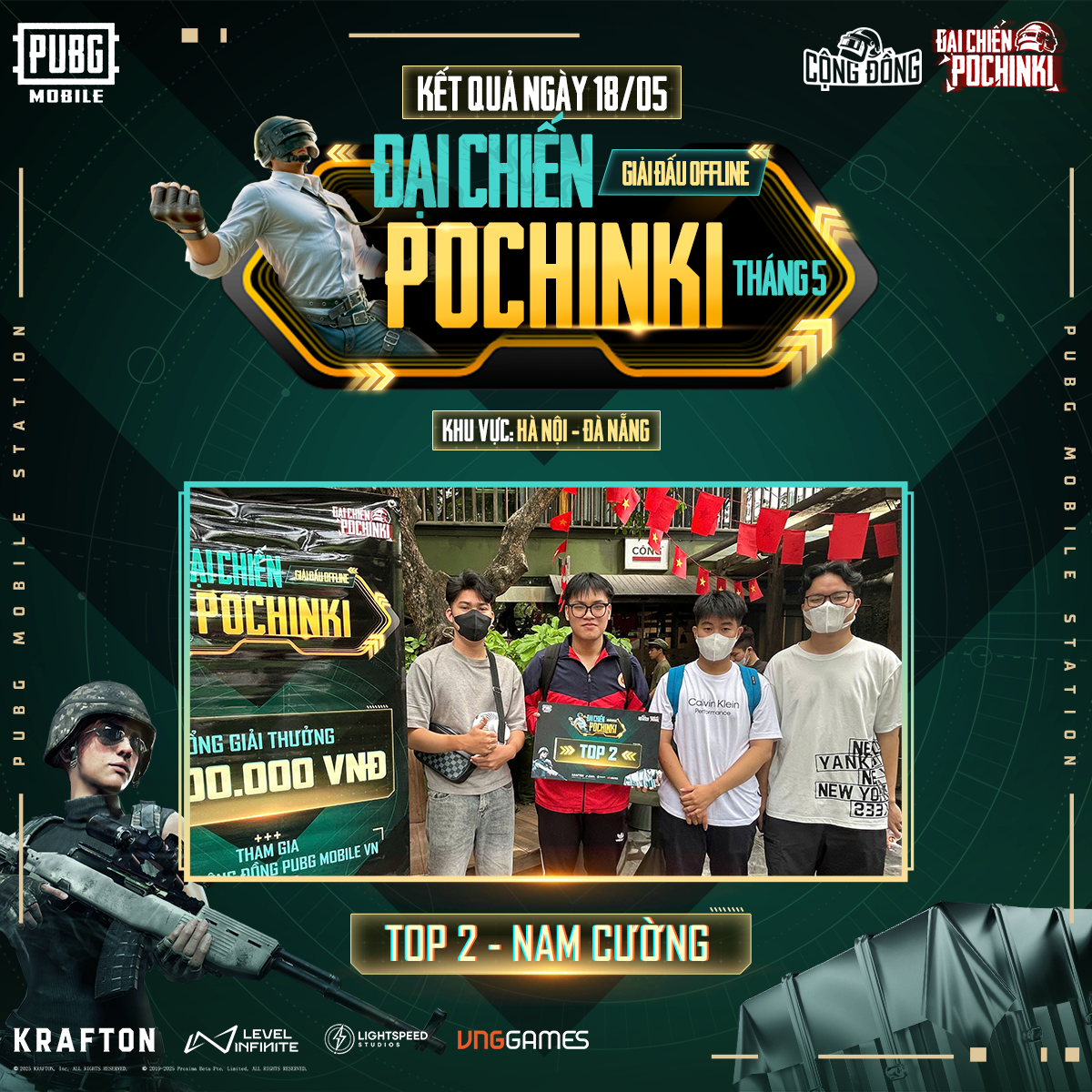 Giải đấu Đại Chiến Pochinki ngày 11/05 đã diễn ra sôi động tại TP.HCM, Hà Nội và Đà Nẵng, quy tụ đông đảo các đội tuyển trẻ và cộng đồng game thủ PUBG Mobile đến thi đấu và cổ vũ.