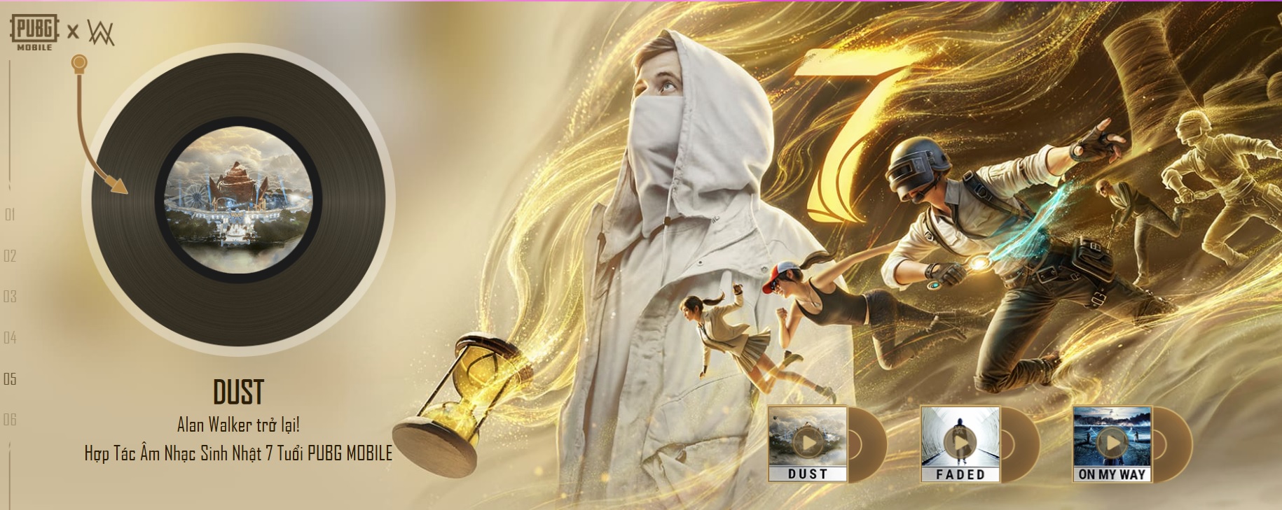 Chắc hẵn các Đồng bo không còn xa lạ với cái tên Alan Walker kèm theo với rất nhiều bản hit: Faded, Alone, Who Am I, v.v... Sự hợp tác trở lại này của Alan Walker cho âm nhạc đồng hành cùng PUBG MOBILE đón 7 tuổi. Chắc chắn sẽ làm các Đồng bo hài lòng.