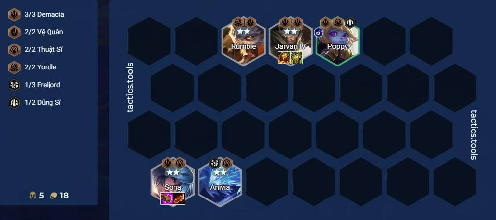 Dùng khung Demacia hoặc thuần Yordle để mở đầu game dễ dàng với các tướng rẻ như Poppy và Jarvan.