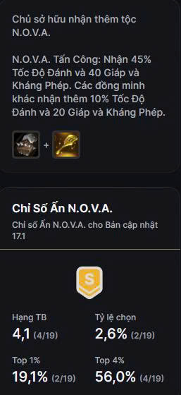 Trong meta đầy biến động của đầu mùa 17, Ấn N.O.V.A nhanh chóng trở thành tâm điểm chú ý nhờ sức mạnh vượt trội. Không chỉ giúp một tướng vươn lên thành carry chủ lực, Ấn N.O.V.A còn gia tăng đáng kể sức mạnh tổng thể của đội hình, tạo lợi thế rõ rệt trong các pha giao tranh.