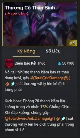 - Kích hoạt: Triệu hồi 20 thanh kiếm, nhận 75% chống chịu và gây 1000 sát thương diện rộng