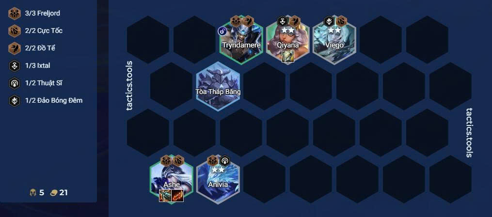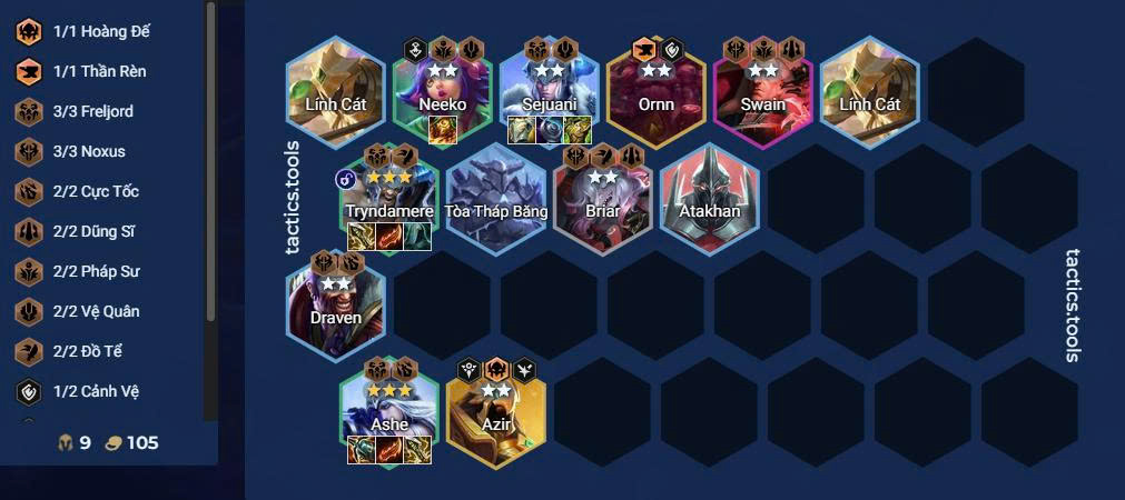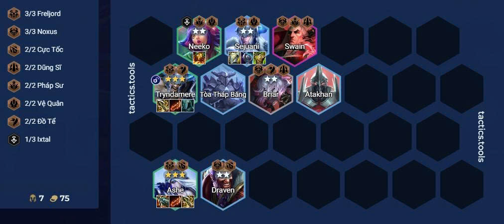 Đội hình xoay quanh Ashe làm chủ lực gây sát thương và Tryndamere làm tuyến đầu vừa khỏe vừa cực kỳ “lì đòn” khi 3 sao. Với meta hiện tại, đây là bài rất dễ triển khai, không bị tranh bài nhiều và cực kỳ hiệu quả trong giai đoạn giữa trận.