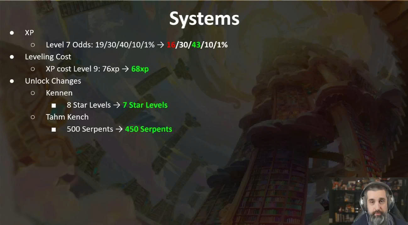 Trong phần hệ thống, Riot Games có đề cập đến lối chơi reroll 3 vàng tại cấp 7 cũng được buff nhẹ. Tỷ lệ ra tướng 3 vàng tăng từ 40% → 43%, trong khi tướng 1 vàng giảm còn 16%.