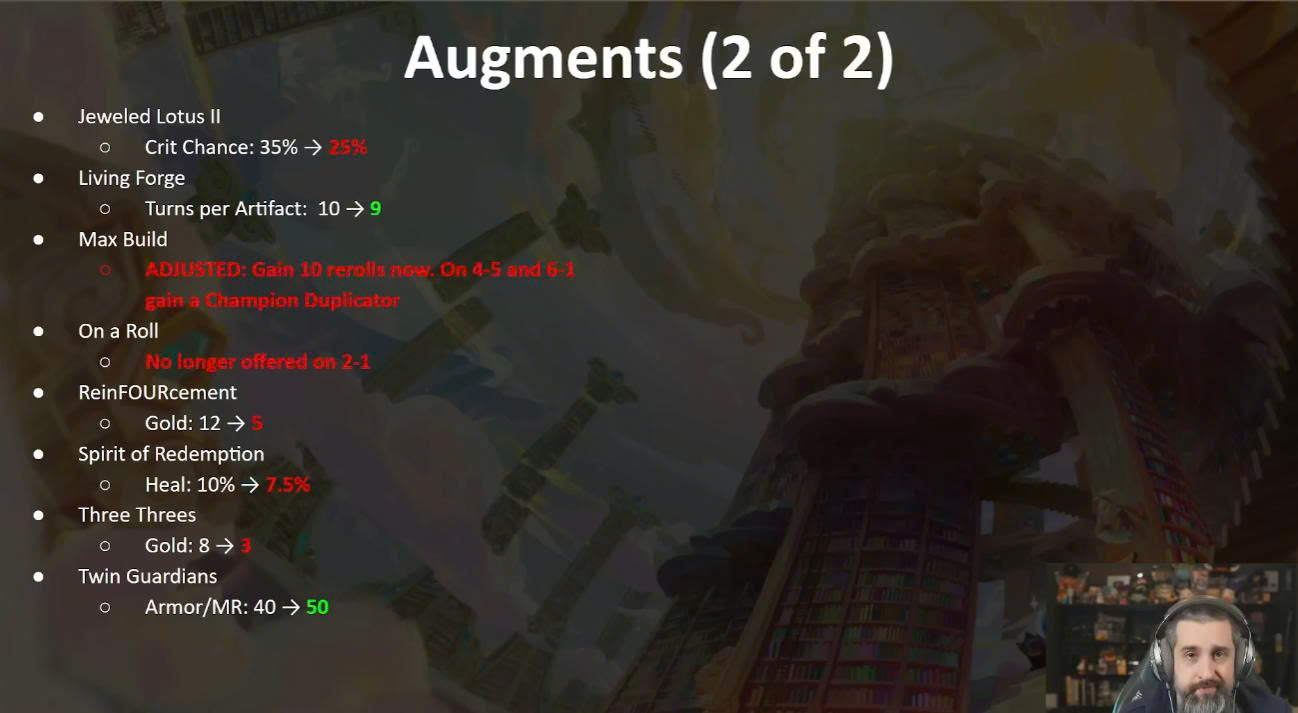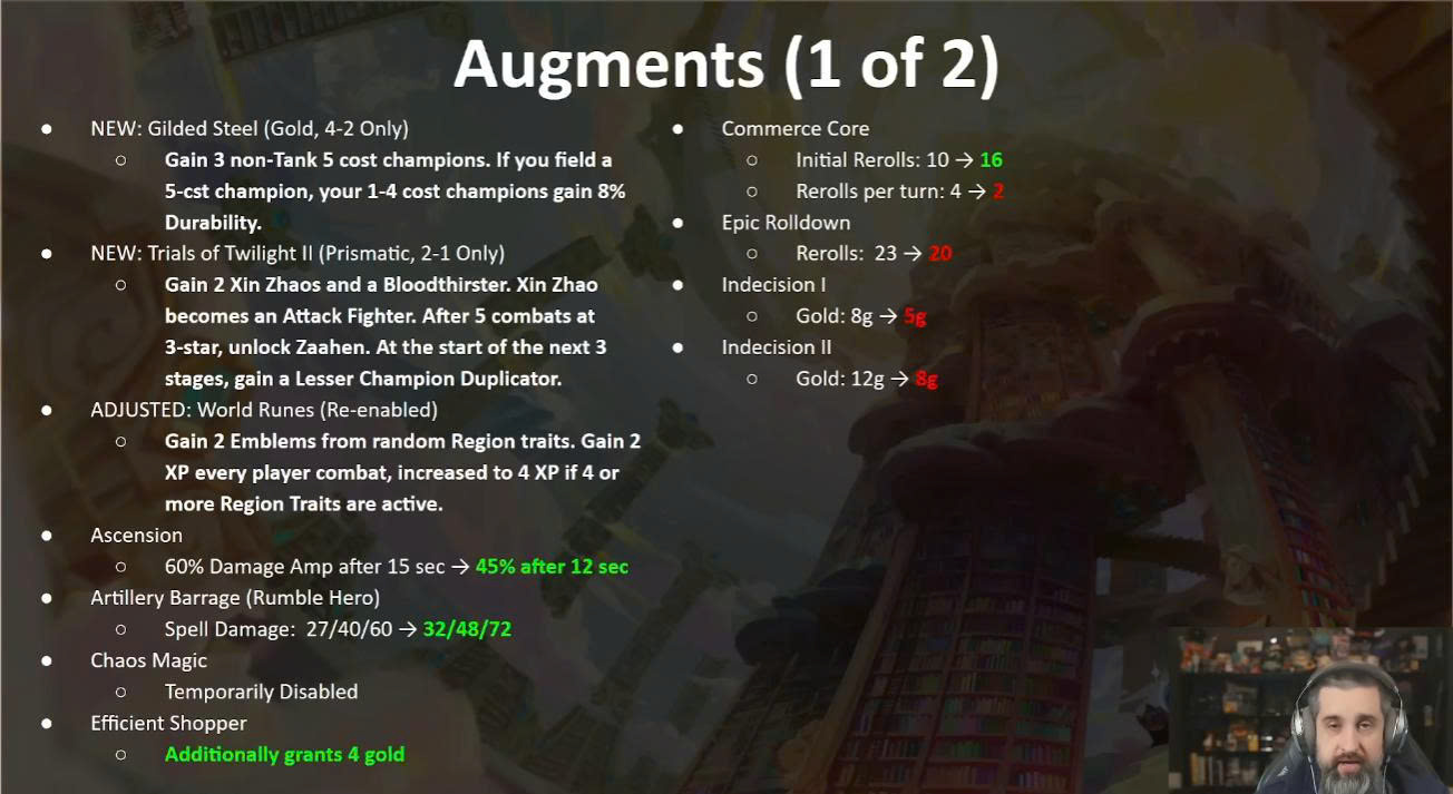 - Một số lõi hỗ trợ reroll 4 vàng như Xúc Xắc Hoành Tráng, Tứ Phương Tiếp Viện bị giảm.