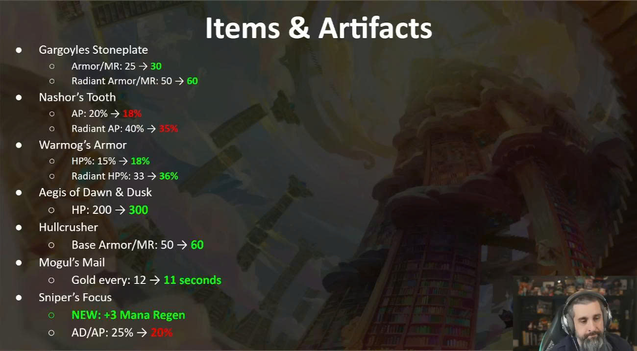 - Nanh Nashor: giảm sức mạnh, trong khi các Tạo Tác như Khiên Bình Minh, Thần Búa Tiến Công lại được tăng chỉ số.