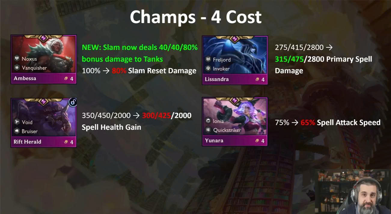 Riêng Sona, do đang thể hiện quá ổn định trong các bài reroll 1 vàng, đã bị giảm lượng hồi máu từ kỹ năng xuống 30/40/65.