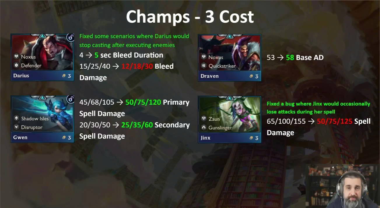 - Draven: nhận thêm 3 sát thương cơ bản, Darius được sửa lỗi chiêu dừng sớm.