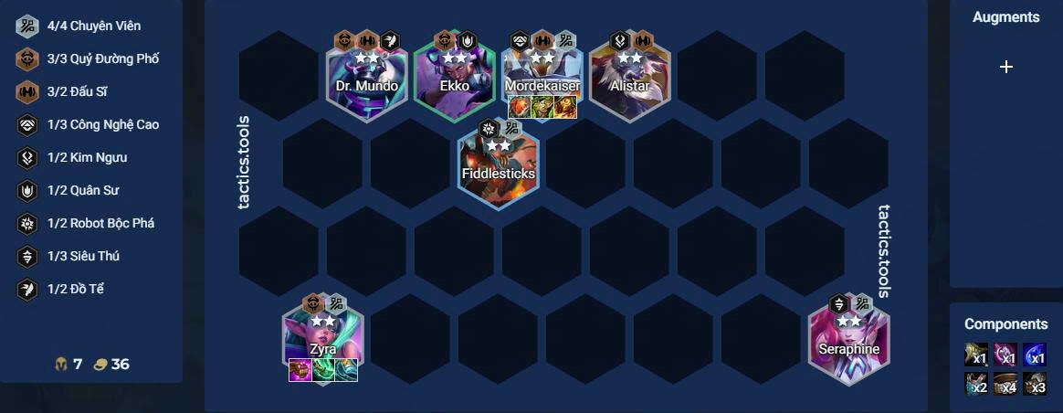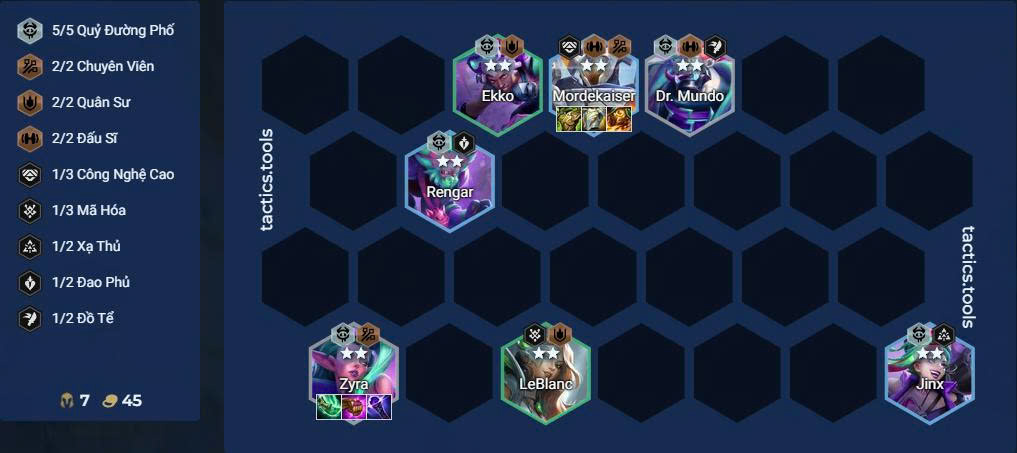 Ở cấp độ 5, hãy sử dụng đội hình Chuyên Viên kết hợp Quỷ Đường Phố – một khung đội hình đã quá quen thuộc với khả năng thủ máu hiệu quả. Chủ lực phòng thủ giai đoạn này là Zyra, với khả năng khống chế diện rộng. Trong lúc đó, người chơi nên ưu tiên lên cấp đều đặn và giữ lại dàn tướng Chuyên Viên cùng các Đấu Sĩ giá rẻ để chuẩn bị cho giai đoạn giữa trận.