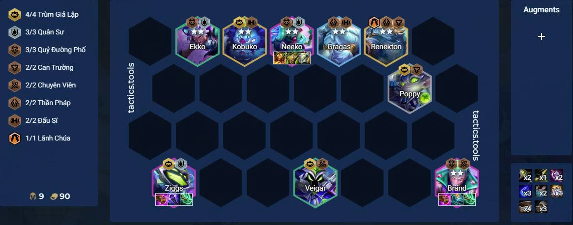 Người chơi nên ưu tiên giữ máu và lên cấp độ 8 sớm để bắt đầu roll tìm các tướng 4 vàng chủ lực như Ziggs, Neeko, Brand, đồng thời bổ sung thêm những tướng phụ trợ quan trọng ở giai đoạn cuối trận như Kobuko và Renekton. Bên cạnh đó, các tướng Trùm Giả Lập giá rẻ từ đầu trận cũng nên được giữ lại xuyên suốt, nhằm kích hoạt hệ sớm và tối ưu đội hình khi bước vào giai đoạn late game