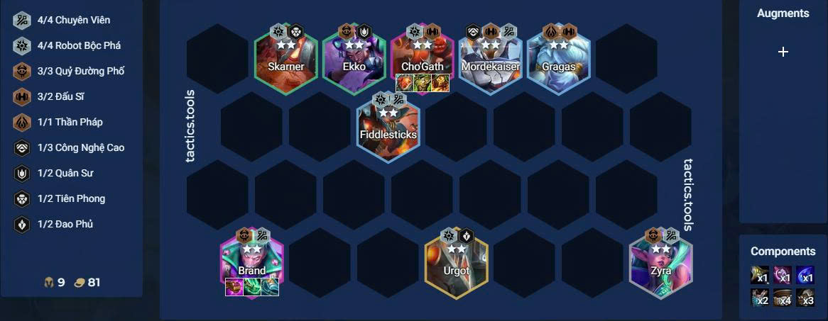 Ở phiên bản này, đội hình sẽ tập trung xoay quanh các tướng 4 vàng – đồng nghĩa với việc giữ máu trong giai đoạn đầu trận là yếu tố then chốt. Một lựa chọn tối ưu để khởi đầu là khung Quỷ Đường Phố, đặc biệt là với Zyra, khi cô nàng đã được tăng sức mạnh đáng kể trong bản cập nhật lần này. Sử dụng Zyra làm chủ lực giữ máu, người chơi có thể dễ dàng lên cấp và hướng đến khung đội hình hoàn chỉnh ở giữa và cuối trận.