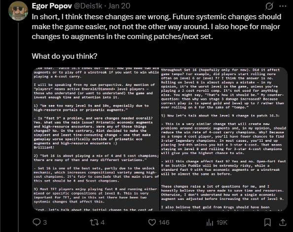 Không chỉ tại Việt Nam, cộng đồng Đấu Trường Chân Lý quốc tế cũng nhanh chóng bày tỏ quan điểm xoay quanh thay đổi ở bản 16.3. Trên nền tảng X, Deis1k - tuyển thủ top Thách Đấu tại một máy chủ lớn đã chia sẻ góc nhìn cá nhân về việc tăng lượng kinh nghiệm cần thiết để lên cấp 9.