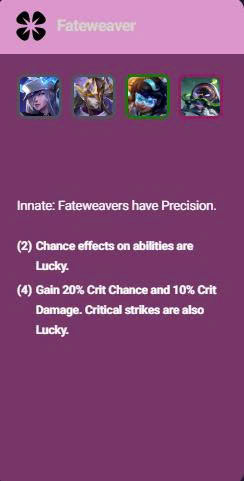 Các tướng Định Mệnh nhận thêm chỉ số Chính Xác, cho phép kỹ năng có thể chí mạng. Đồng thời, hiệu ứng May Mắn giúp các kỹ năng “tung xúc xắc” hai lần và lấy kết quả cao hơn: