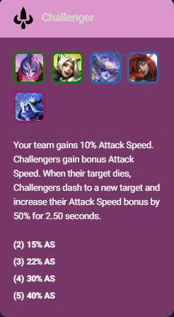 Toàn đội nhận 10% Tốc Độ Đánh. Các tướng Thách Đấu được gia tăng thêm Tốc Độ Đánh và sẽ lướt tới mục tiêu mới mỗi khi hạ gục kẻ địch, đồng thời nhận thêm 50% Tốc Độ Đánh trong 2,5 giây: