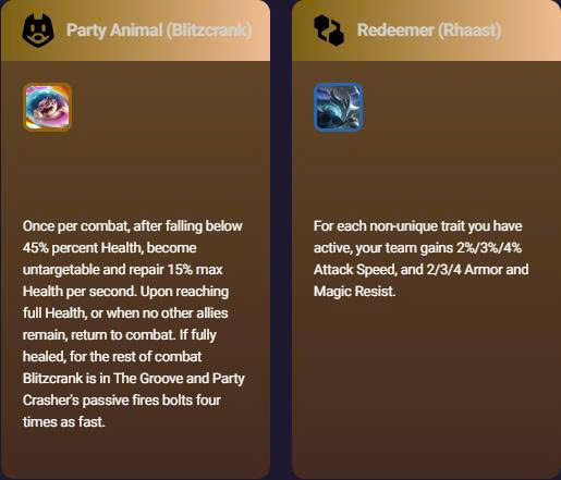 Tiệc Tùng (Blitzcrank): Khi dưới 45% Máu, trở nên vô hình và hồi 15% Máu mỗi giây; sau đó lao vào giao tranh với tốc độ cao và kỹ năng được cường hóa.