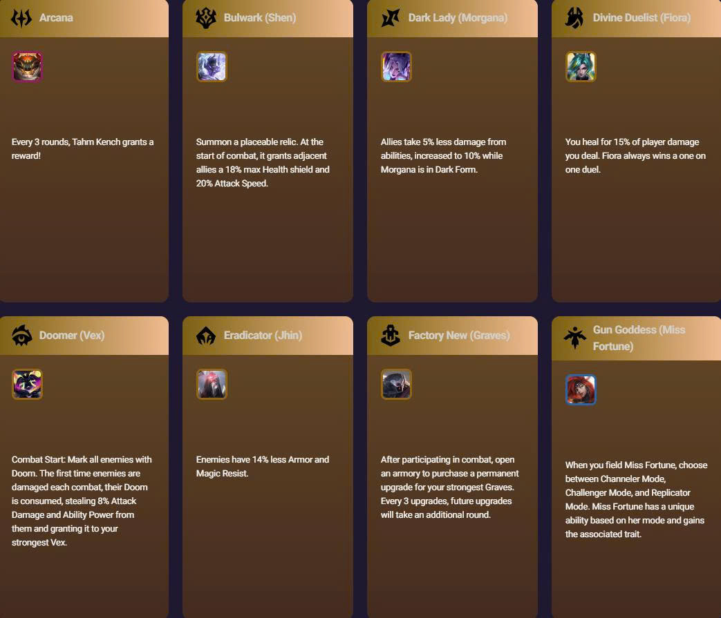 Tướng: Veigar (1 vàng), Lissandra (1 vàng), Pantheon (2 vàng), Lulu (3 vàng), Miss Fortune (3 vàng), Nami (4 vàng).