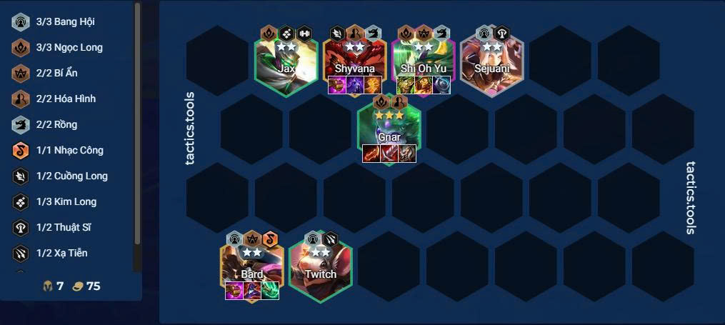 Đội hình Gnar carry trong bản Tái Hiện ĐTCL 7.5 không chỉ mạnh nhờ khả năng reroll ổn định, mà còn cực kỳ linh hoạt và dễ dàng chuyển đổi giữa 5 Ngọc Long và 2 Hóa Hình – 3 Bang Hội. Nếu bạn đang tìm một lối chơi vừa dễ vào top, vừa thỏa mãn niềm vui gánh team, Gnar chính là lựa chọn hoàn hảo để leo rank hiệu quả trong giai đoạn này.