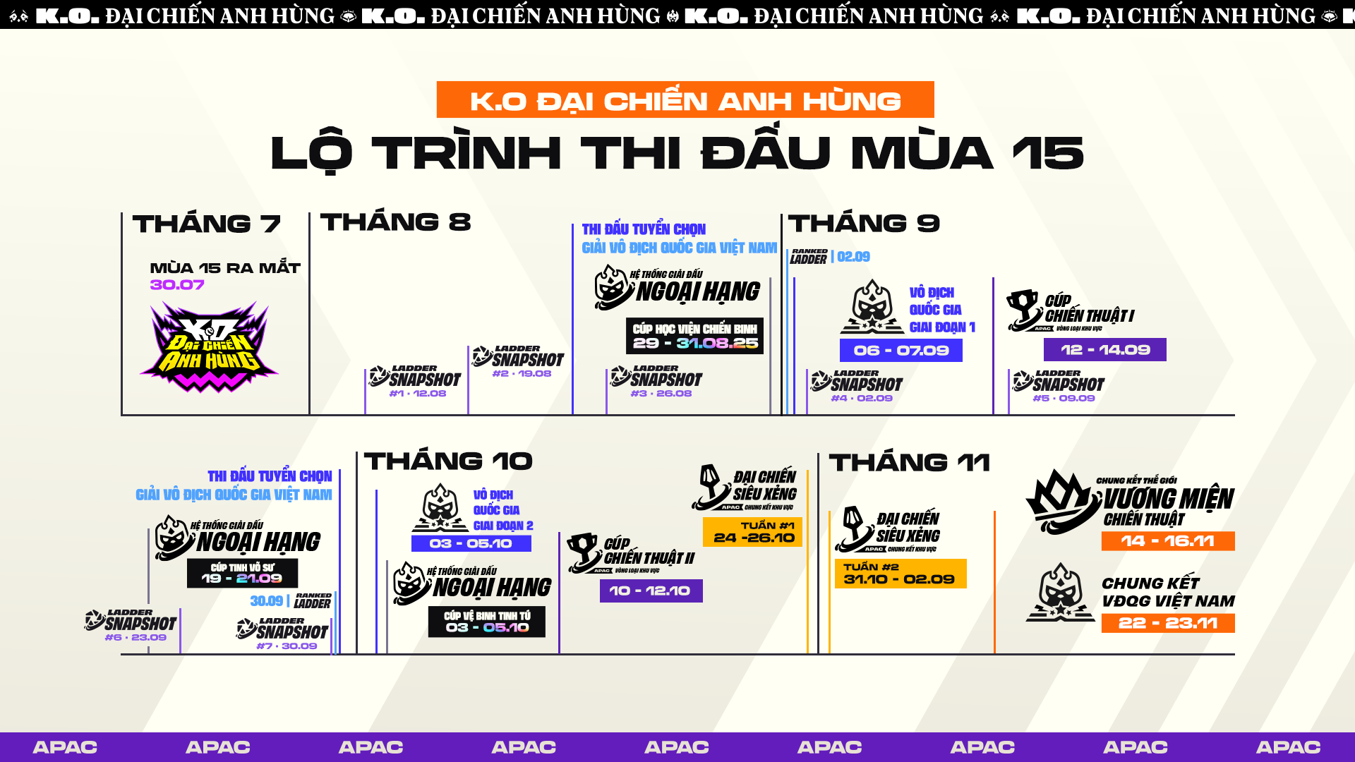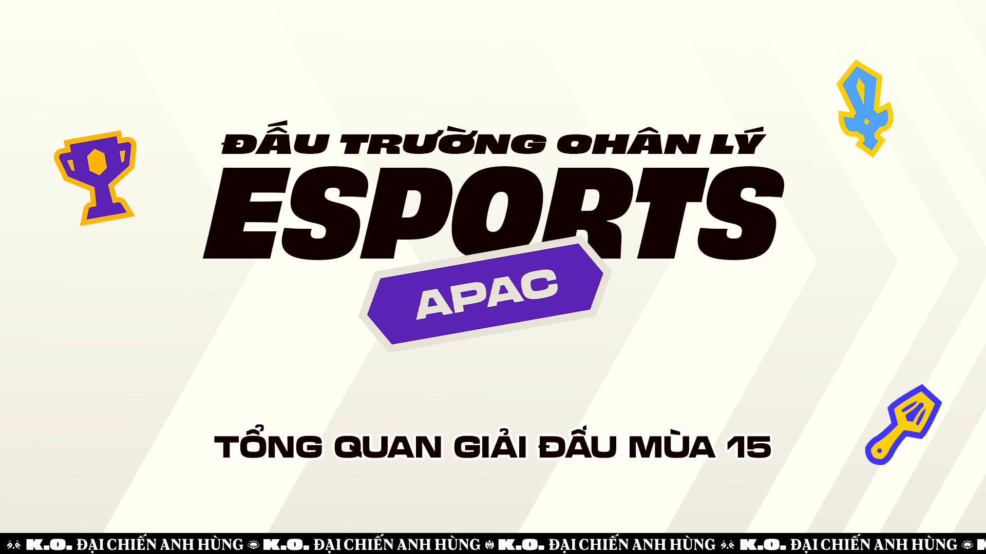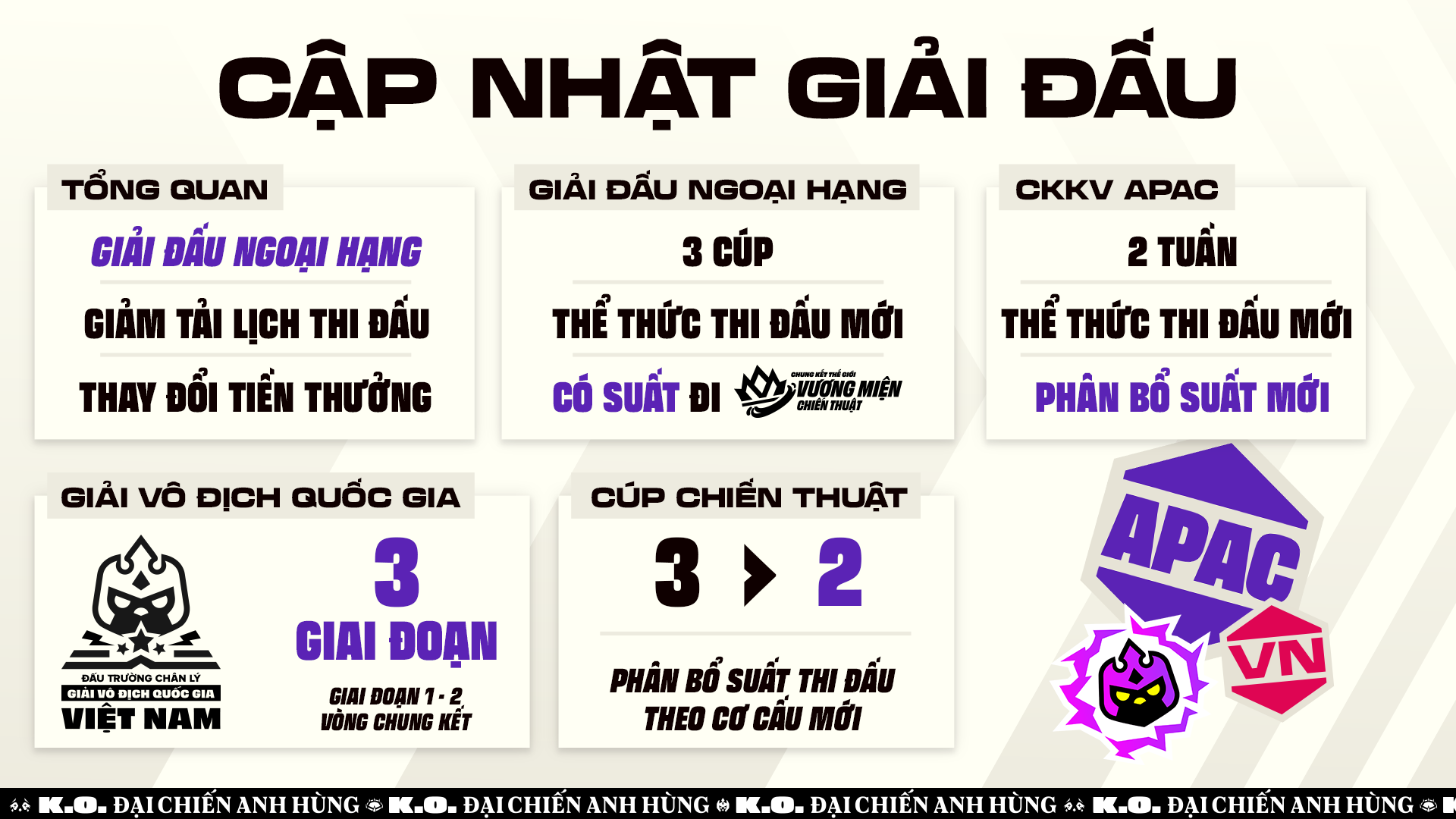 Sau Mùa 14 sôi động với sự đăng quang của tuyển thủ Nhật Bản - Summertimer, ĐTCL nay chính thức giới thiệu một lộ trình thi đấu Thể thao điện tử mới dành cho khu vực APAC trong Mùa 15:“K.O - Đại Chiến Anh Hùng”, với các ý chính sau: