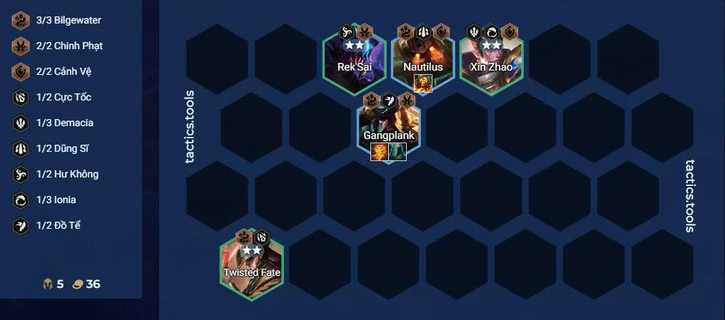 Đội hình giai đoạn đầu có thể gồm: Gangplank – Graves – Twisted Fate – Nautilus.