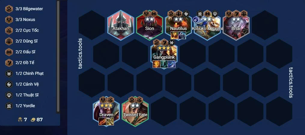 - Đặt Nautilus tank giữa, Draven – Gangplank ở góc có thể tận dụng hiệu ứng Bilgewater tốt nhất.