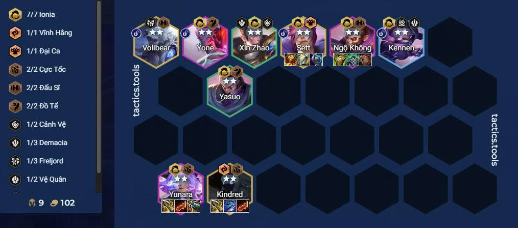 - Yunara (carry) + Ngộ Không (tank) + Sett/Kindred (sub carry) + Shen, Yasuo, Xin Zhao (kích hoạt đầy đủ tộc/hệ Ionia).
