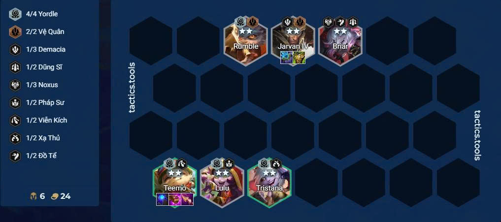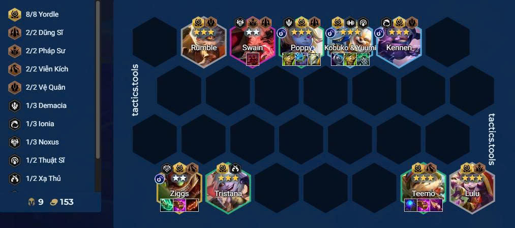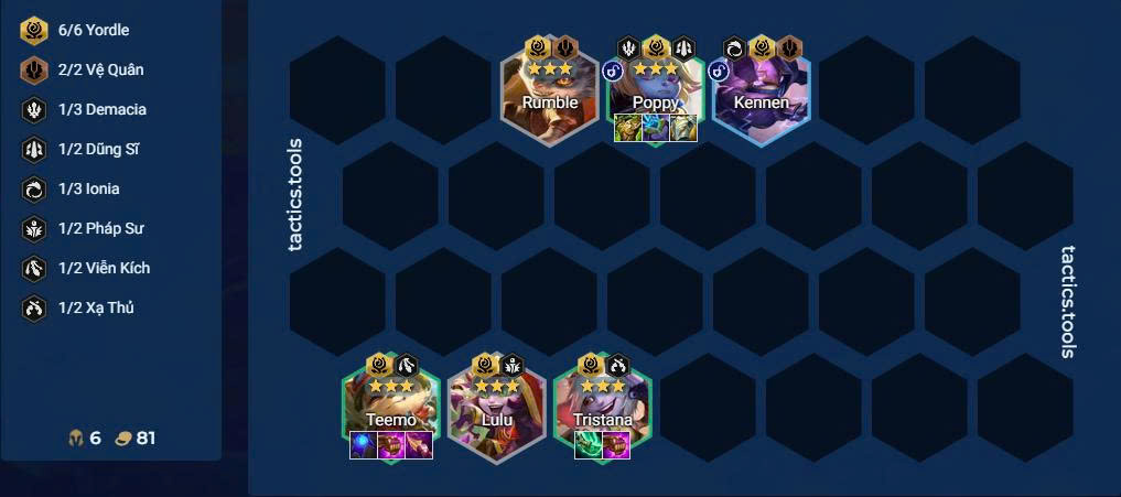 - Mục tiêu: Mua càng nhiều tướng Yordle rẻ tiền càng tốt (Lulu, Rumble, Teemo, Poppy, Tristana).