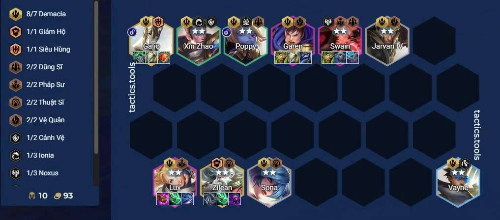 - Garen – Vayne – Lux – Poppy – Sona – Swain (5 Demacia + 2 Pháp Sư + 2 Dũng Sĩ + 2 Thuật Sĩ).