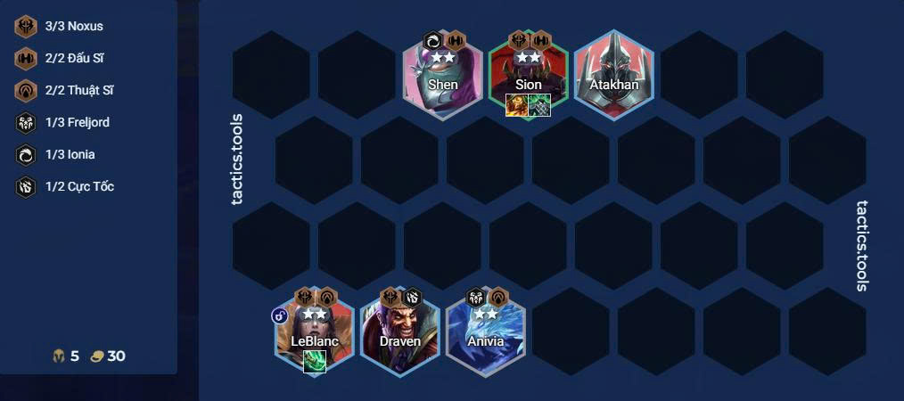 Nếu có Draven sớm, bạn có thể tạm thời sử dụng hắn để farm Ngưỡng Mộ, đồng thời tận dụng khung Sion + 2 Noxus để cứng cáp giai đoạn đầu.