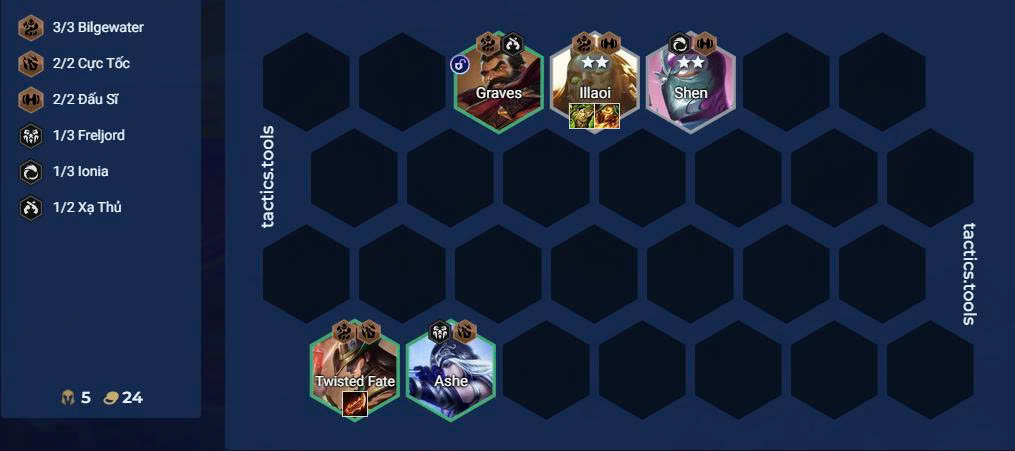 Ở giai đoạn khởi đầu, người chơi nên bắt đầu với đội hình Bilgewater cơ bản. Twisted Fate đóng vai trò carry chính nhờ khả năng gây sát thương sớm và dễ lên 2 sao. Tuyến trước nên ưu tiên Illaoi và Nautilus – bộ đôi chống chịu đáng tin cậy giúp bạn giữ máu ổn định.