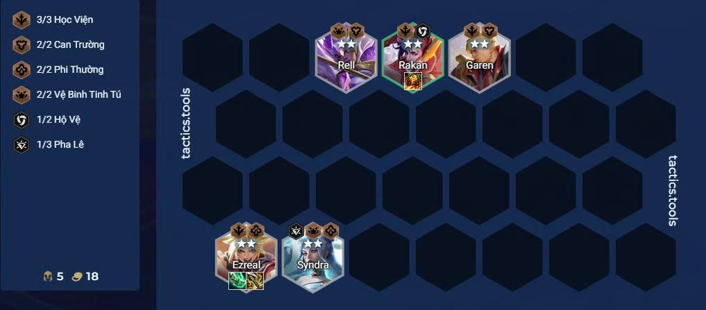 - Lên cấp 4 ở vòng 2-1, ưu tiên chơi khung Học Viện với Đấu Sĩ/Sát thương mạnh như Garen, Ezreal, Rakan để giữ máu và tích lũy vàng.