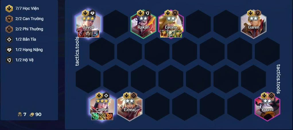 - Lớp Trưởng: buff mạnh cho toàn bộ tướng Học Viện, cực kỳ phù hợp với đội hình này.