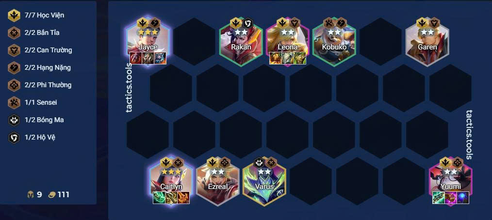 Đội hình thường xoay quanh: Caitlyn, Jayce, Garen, Ezreal, Rakan, Kobuko, Leona, Yuumi và Varus. Độ khó triển khai ở mức trung bình, chủ yếu dựa vào slow roll tại cấp 7 để hoàn tất dàn chủ lực 3 sao.