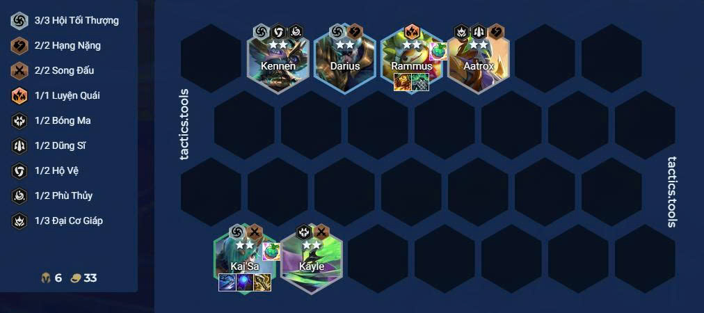 - Tối ưu đội hình với 5-6 Hội Tối Thượng, kết hợp Kai’Sa và Rammus làm chủ lực.