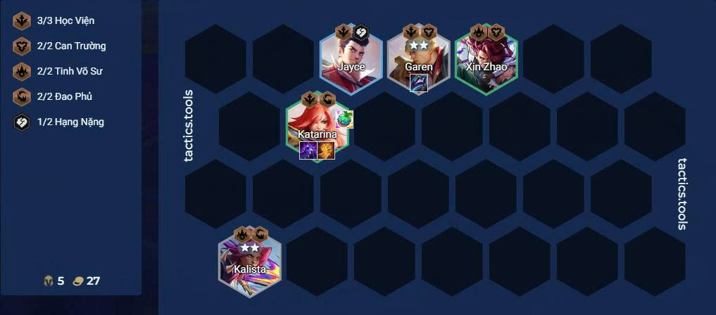 - Mua Katarina ngay khi thấy có thể, build đội hình kẹp Học Viện, Đao Phủ để giữ máu hiệu quả.