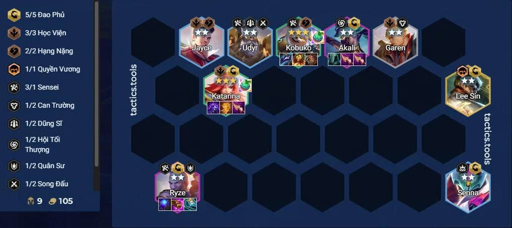- Bổ sung các tướng chống chịu/tank mạnh như Janna, Udyr. Không lên quá 4 Sensei trên sân (tính luôn Katarina).